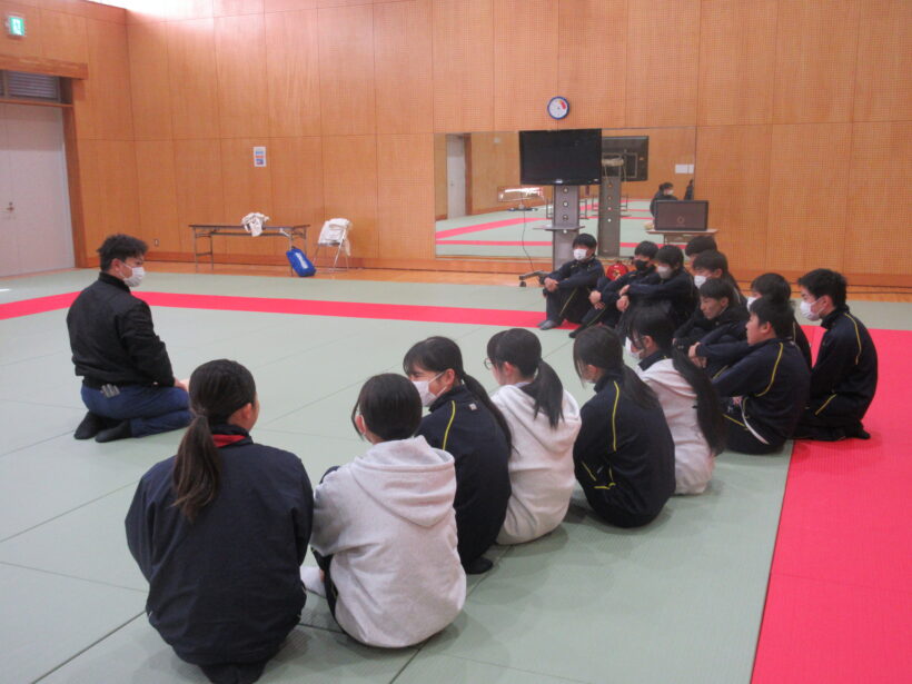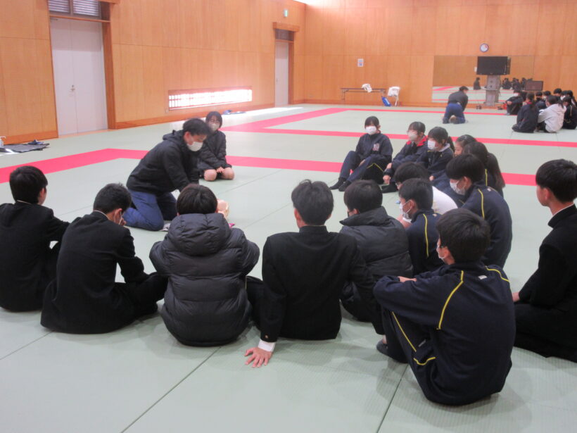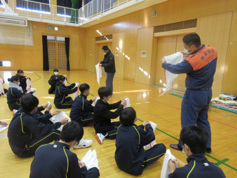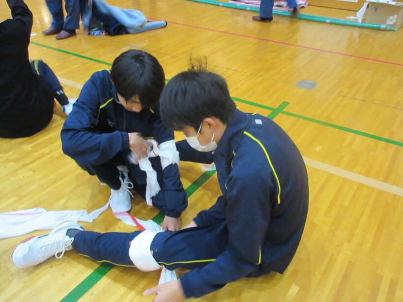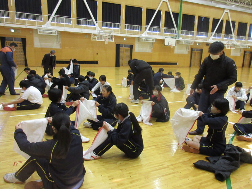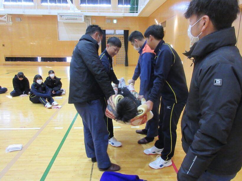今日、消防署の方々にお越しいただき、2年生の皆さんが救命救急に役立つ実技を学んでいます。