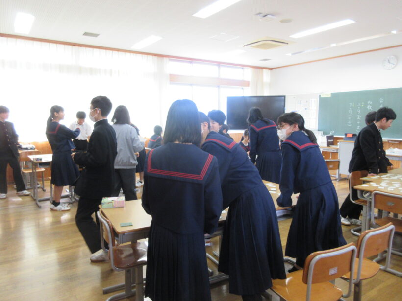国語では百人一首で大盛り上がりしています。上の句、下の句と一致するものを探すのですが、文字だらけのカードは見づらい(;´∀`) せめて、何かイラストでもあればな…。老眼には厳しいですが、みんなにははっきり見えているようです(笑)