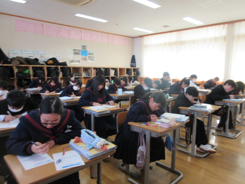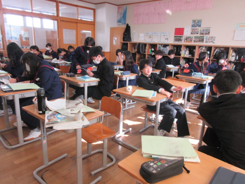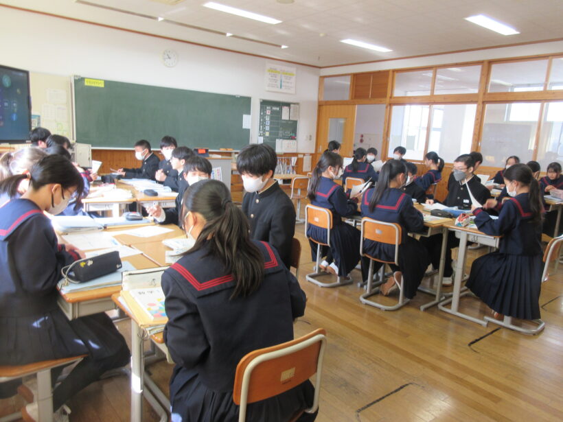 数学ではグループで答え合わせをしています。「この答え、なんかちょっと違うなぁ」と言っている人が、同じグループの人から「まずは自分の課題やってからやろ!」と注意を受けています(;^ω^) え?書いてないように見える?心の目で見てほしいなぁ~、とか言ってる場合ではない(;´・ω・) まずは自分の課題を終わらせるので、終わるまで見守ってください(笑)
