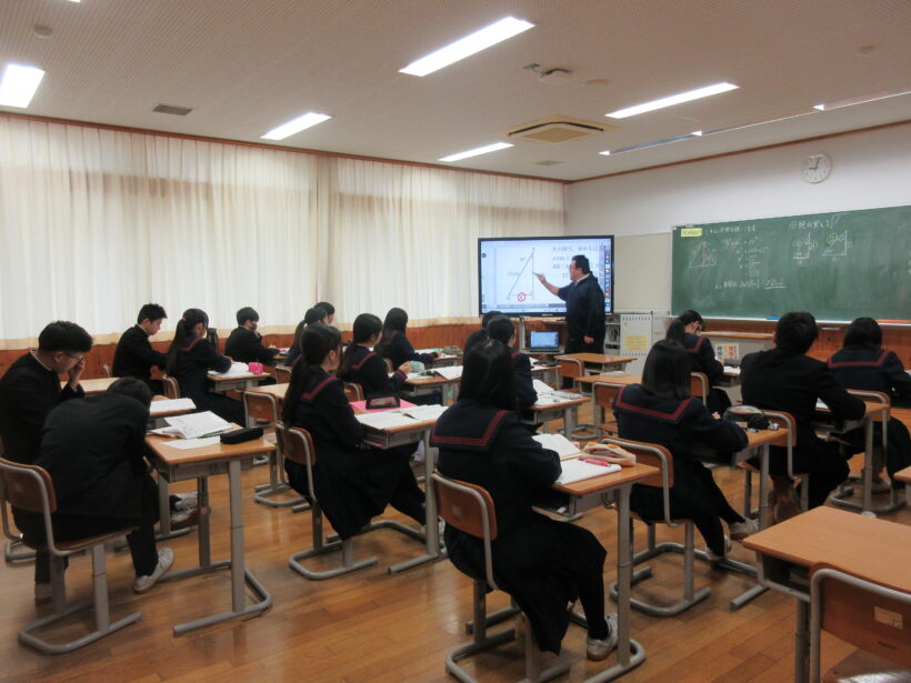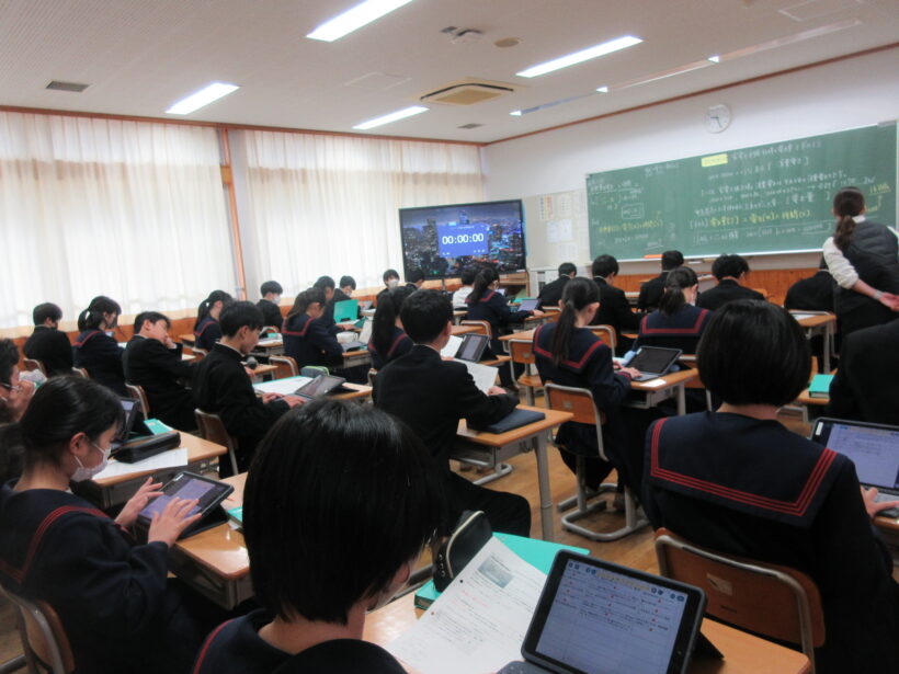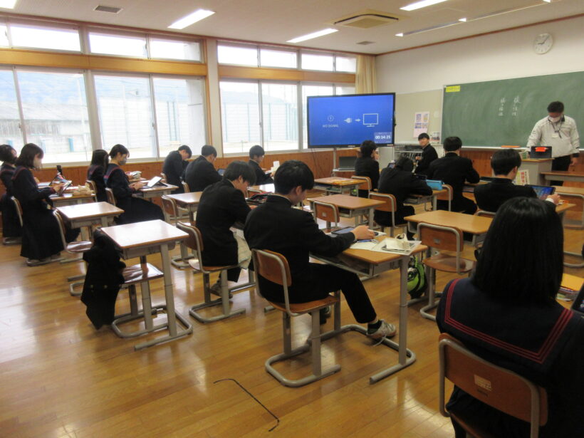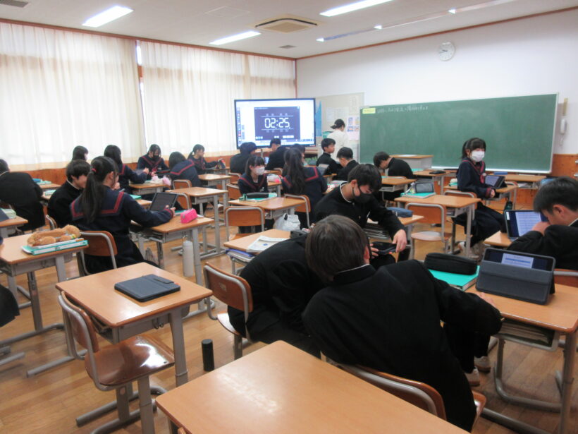 朝の会の前に時間割の連絡ボードを眺めている3年生。あまり元気がないようです(@_@) 声をかけると授業がイヤだそう(;´∀`) 入試対策のため、これまでのテストをもう一度やってみるということらしいです。「テスト」以上に「入試」がイヤなのでは…?