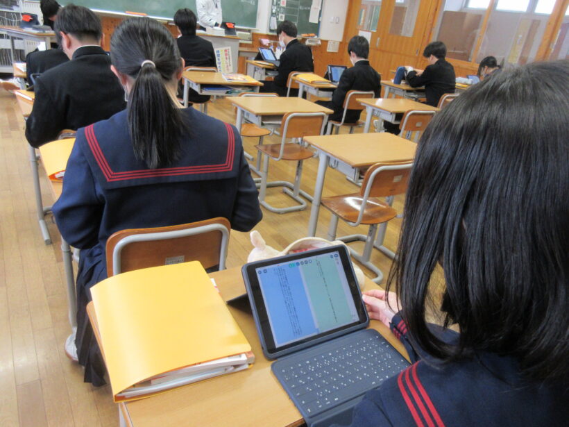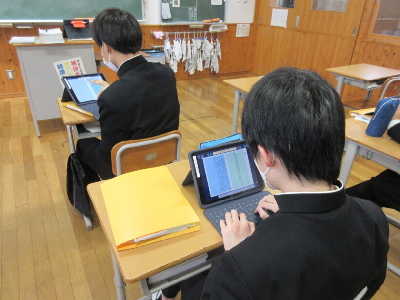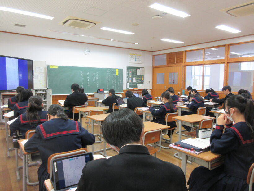 国語ではどのくらいの時間でどのくらい文が書けるのか、テーマを決めて練習中です。「思い出」をテーマに「修学旅行」「体育祭」「音楽祭」「地域イベント」「部活動」など、それぞれが理由を付けてしっかり書けています。