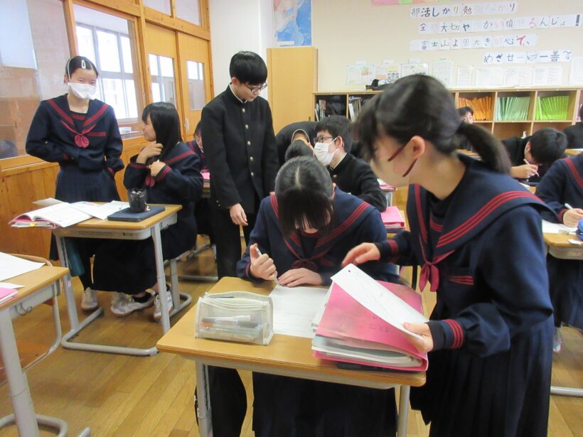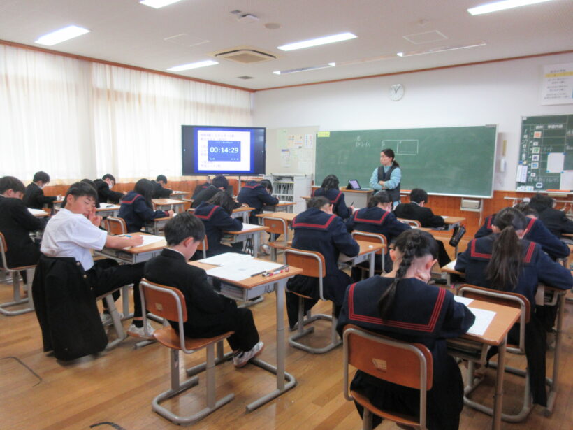 社会、理科、数学の授業をしています。しかも、理科は単元テストです。みんな自主学習でまとめた内容を持ち込みしてのテストですので、今日までどれだけ頑張ったか、が問われます。ま、余裕でカメラに目線をくれる人がいるっていうのはどうだかねぇ(;´∀`)