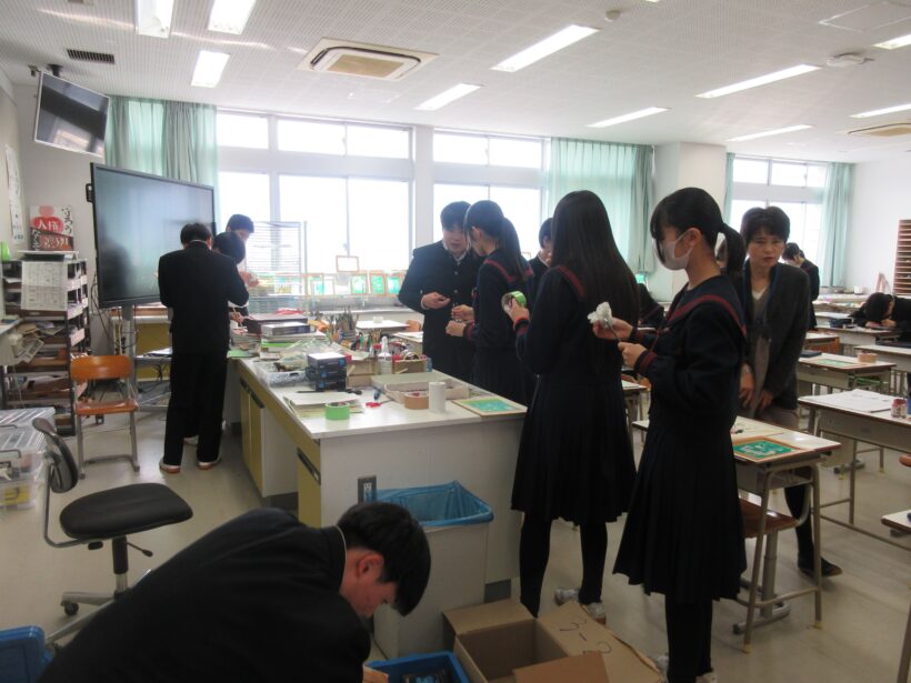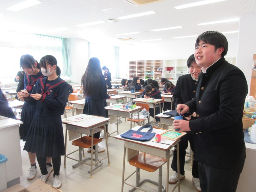 3年生の美術。自分がデザインしたものをカバンやシャツに写すため、好きな色を合わせて混ぜています。その色が予想以上によどんでいたため、周囲は爆笑の嵐。何をどうやったらこの色になるん?と思うほどよどんでいます(;^ω^) 心は本当にキレイなのにね?(笑)