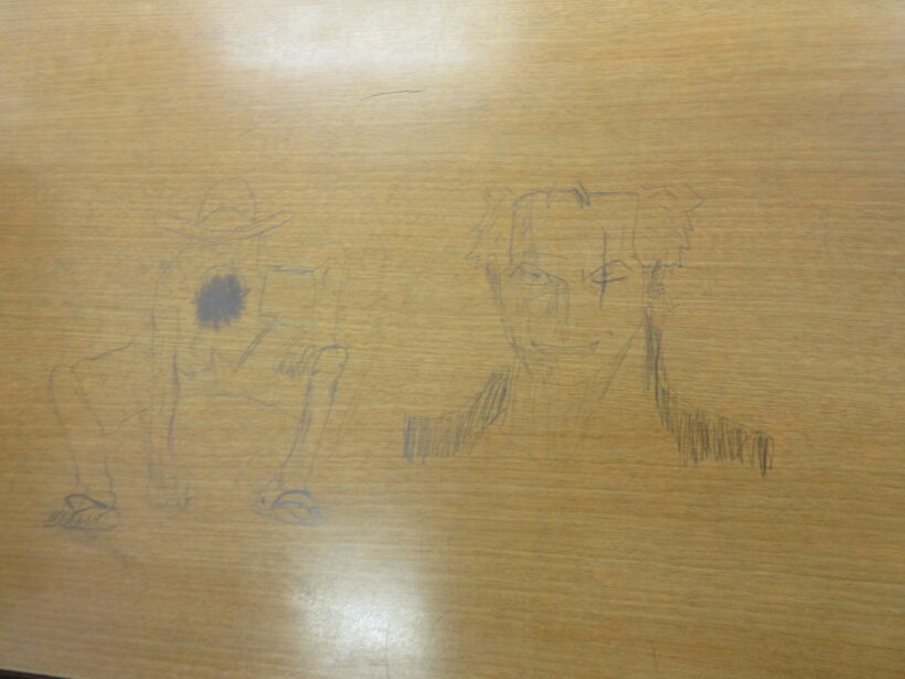 やっぱり… 静かに勉強していると思ったら、机に絵を描いている人。早く消さないと、ゴムゴムの実を口に入れるよ(^_^メ)