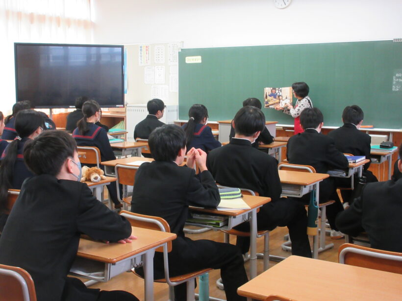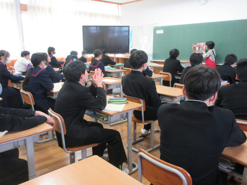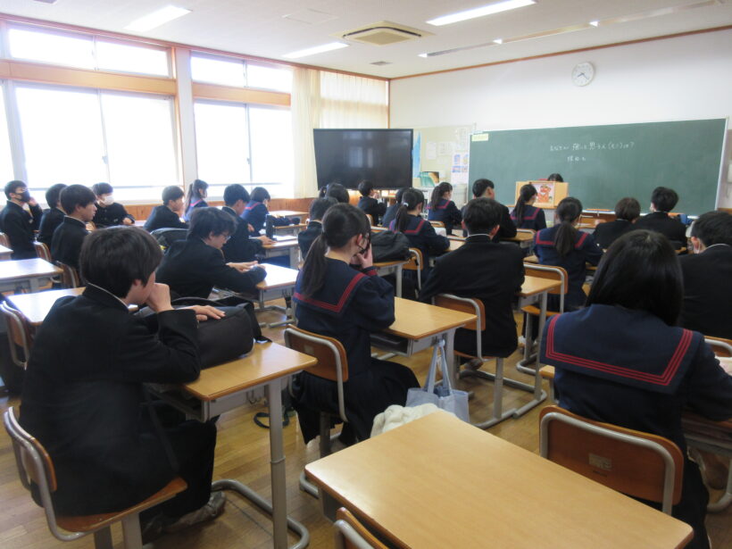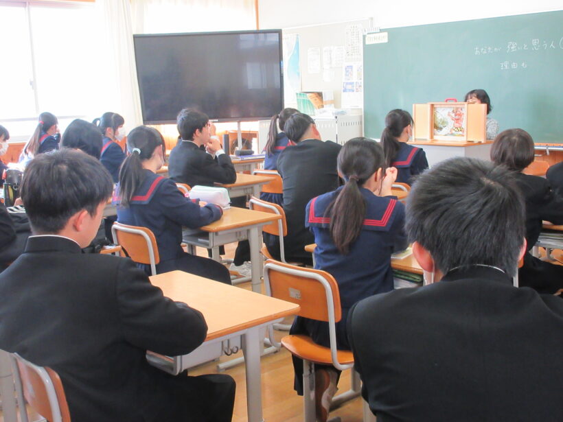 「うみにしずんだ おに」の紙芝居と「希望の牧場」という絵本です。どちらのお話も聞いていれば、とても深~いと感じます。しかも教室の黒板には「あなたが強いと思う人や物」と書かれています。「おに」も「牛飼い」も強いと思います。