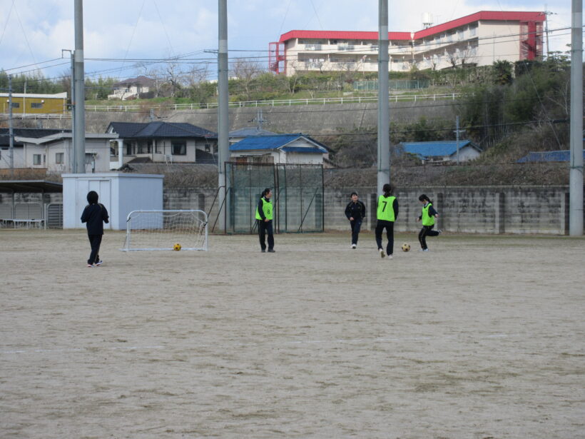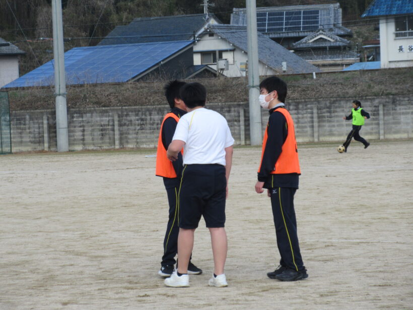 ゲーム中の作戦会議なのか、3人で話をしています。前半のリフティング練習の反省会でしょうか… とても真剣な表情(◎_◎;) まずはゲームに集中してほしいけど(;^ω^)