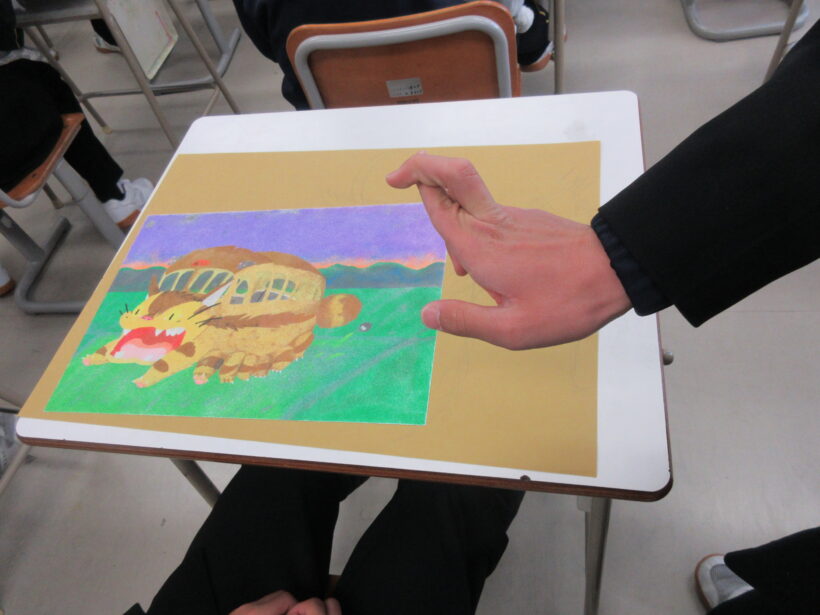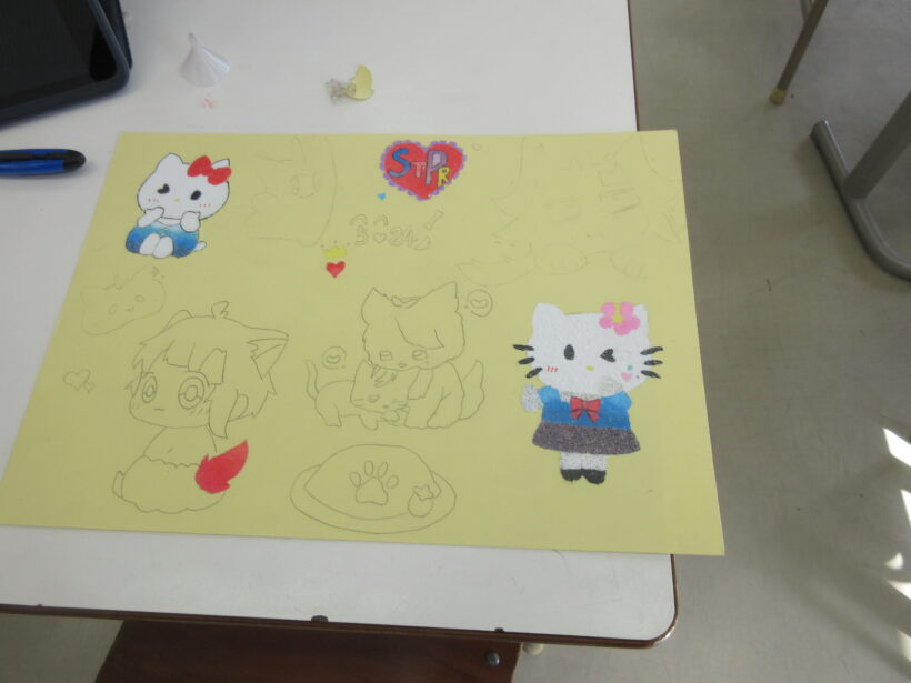 美術室では砂絵の製作。本当にみんな器用です。