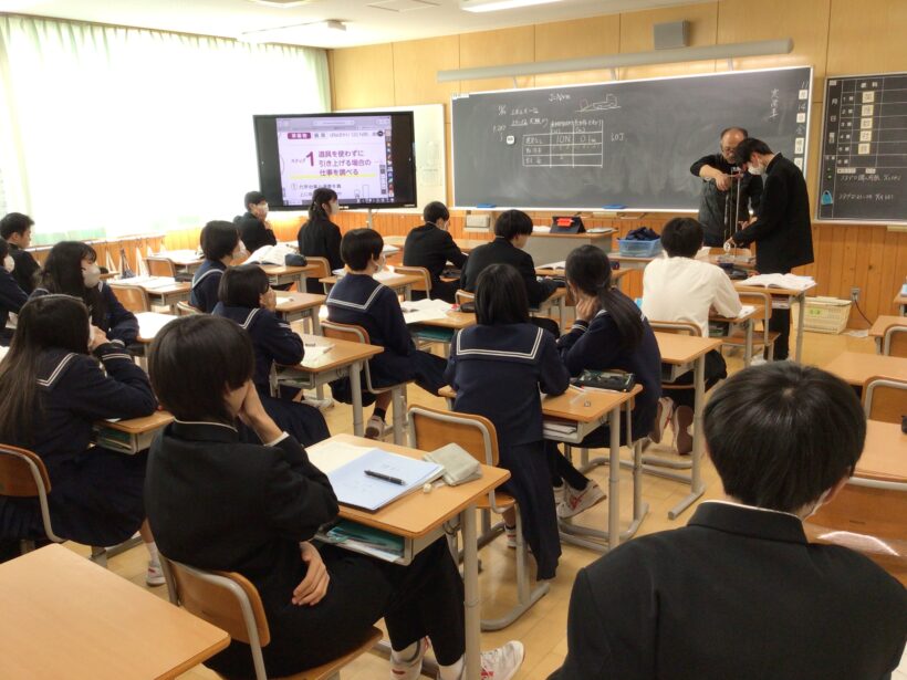 【3年生理科】動滑車を使った実験です。先生のアシスタントをしてくれいます。力が半分になるって不思議〜。