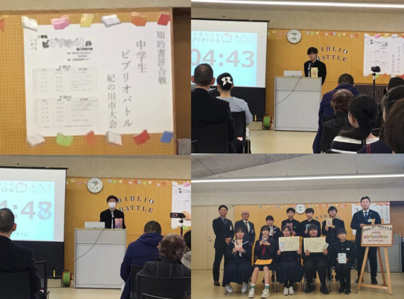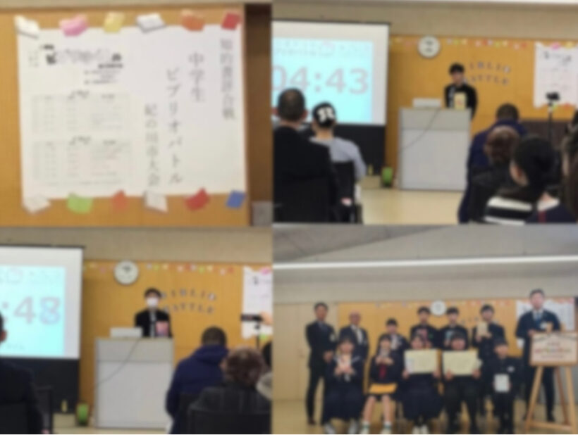 【紀の川市ビブリオバトル】2年生から2名の生徒が代表として出場してくれました。4組の谷野さんと2組の中井さんが読みたくなるような本の紹介をしてくれました。惜しくも決勝には残れませんでしたが、出場することが貴重な経験になったと思います。「ざんねんないきもの辞典」「空想科学読本」どちらも私も気になっていた本でしたのでとても興味を持ち聞かせてもらいました。😃