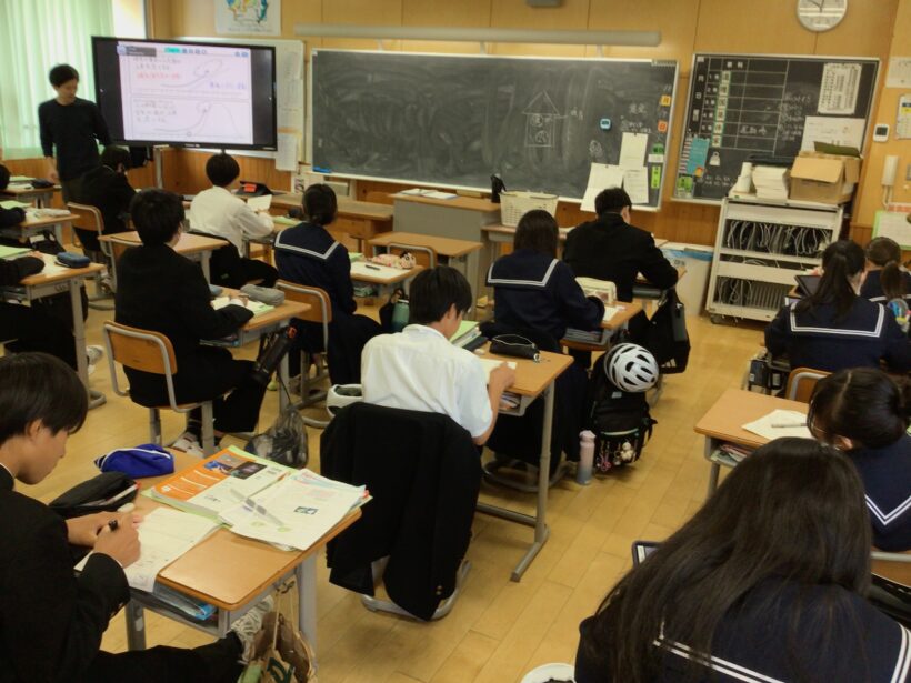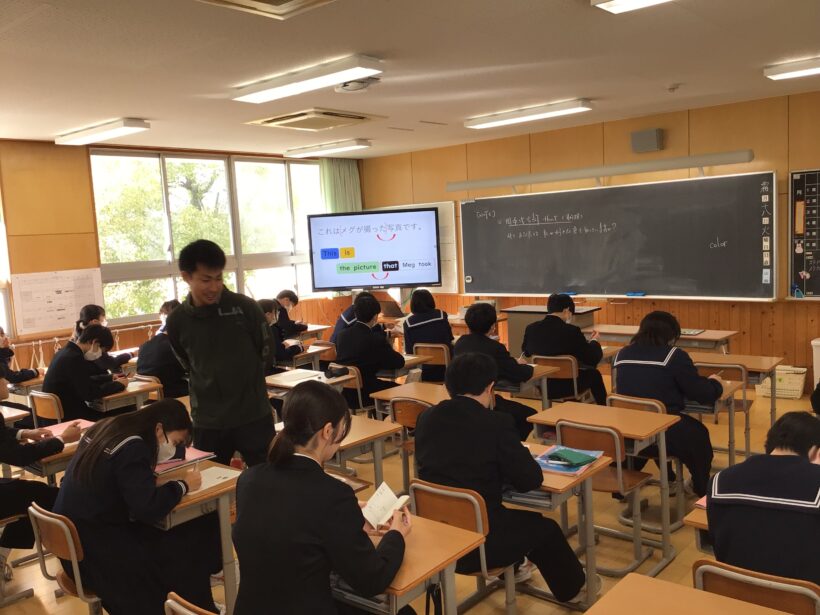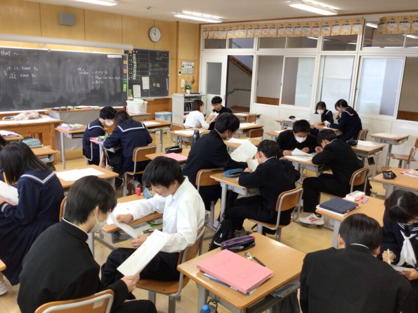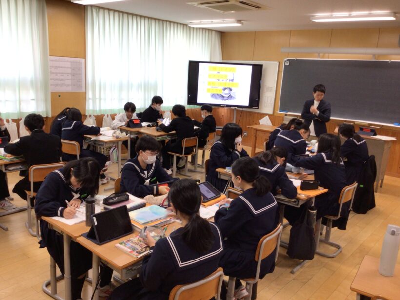 【3年生技術科】めあて「エネルギー変換の仕組みを知る」の学習です。これから人類にとってエネルギーはとても大切ですから、しっかり学習してくださいね。【3年生英語科】「関係代名詞 that 目的格」の構文を使っての会話にチャレンジしていました。【2年生英語科】今学習している部分の「高速インプット」をペアで行っています。【2年生理科】「天気」の学習で雲のできる理由を図に書いてまとめていました。日常何気なく見ている「雲」のでき方を知り、驚いている生徒もいるようです。 【2年生社会科】めあて「ヨーロッパの国家としてまとまりは、その後や今の日本にどんな影響をおよぼしているのか?」の学習です。個人で調べてまとめている生徒、eライブラリを繰り返しチャレンジしている生徒それぞれしっかり取り組んでいます。2年生職場体験の事業所でのスナップ写真を使った「フォトコラージュ」です。廊下に掲示されてました。おもしろいですね😃