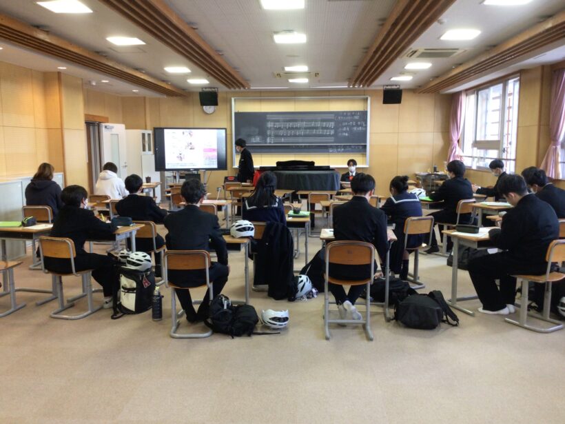 【1年生音楽科】聞き取り練習をしていました。「能」の演奏形態や歌の様子を確認しています。聞いたことのある音楽ですね。普段あまり触れないでしょうが・・・・。これを機会に日本の伝統音楽にも親しんでいければいいですね。