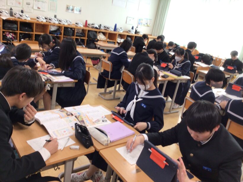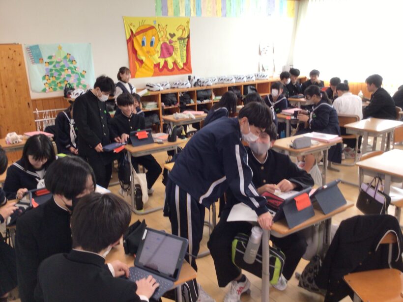 【2年生英語科】「英語でアンケートをつくろう」の学習です。実際に自分たちが調査したいアンケート作りを友達と相談しながら行なっています。実生活につながる英語学習ですね。