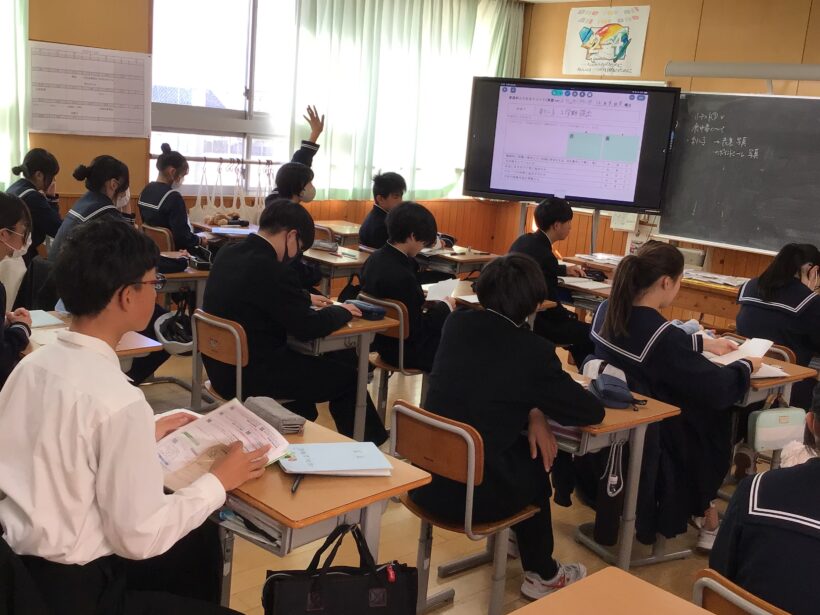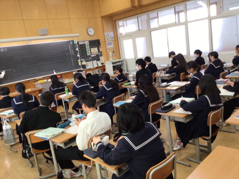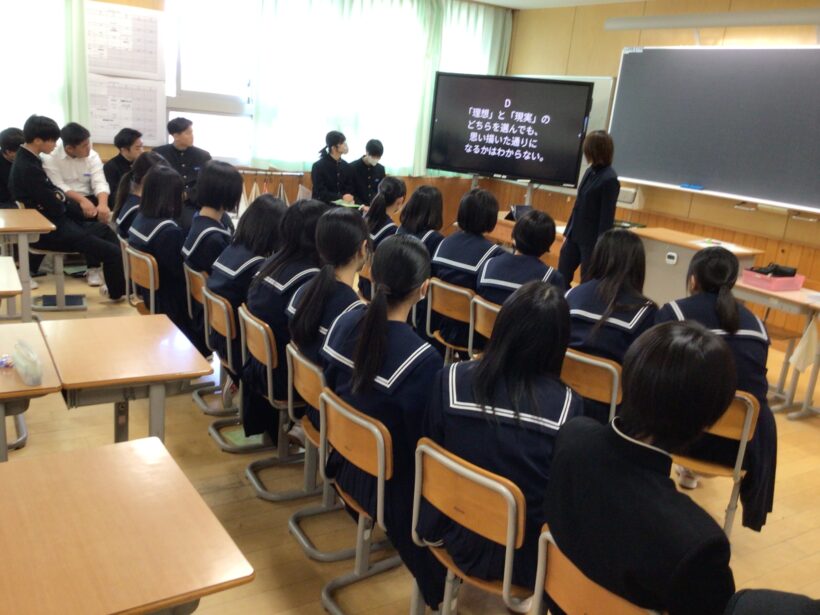 【3年生道徳科】「好きな仕事か安定か悩んでいる」の教材文を使い、将来の自分を考える学習です。内容項目「向上心、個性の伸長」で教材文の4人の意見に対して自分は誰の意見に近いのかまず考えていました。グループ等での意見交換を通して、「やっぱり安定かな」と意見が変わる生徒、「どちらも大切にしたい」という生徒もいました。多面的・多角的に自分の考えを深めることができました。