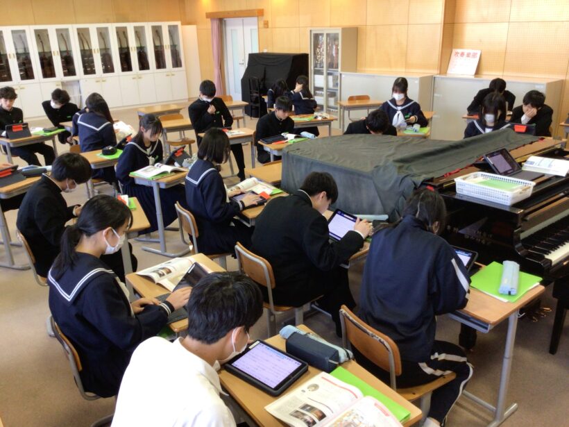 【2年生音楽科】めあて「オペラの良さを感じよう」の学習です。「アイーダ」問いう楽曲を鑑賞した後、作曲者「ヴェルディ」の人物に迫り、楽曲「アイーダ」の作品について自分で調べてまとめていました。