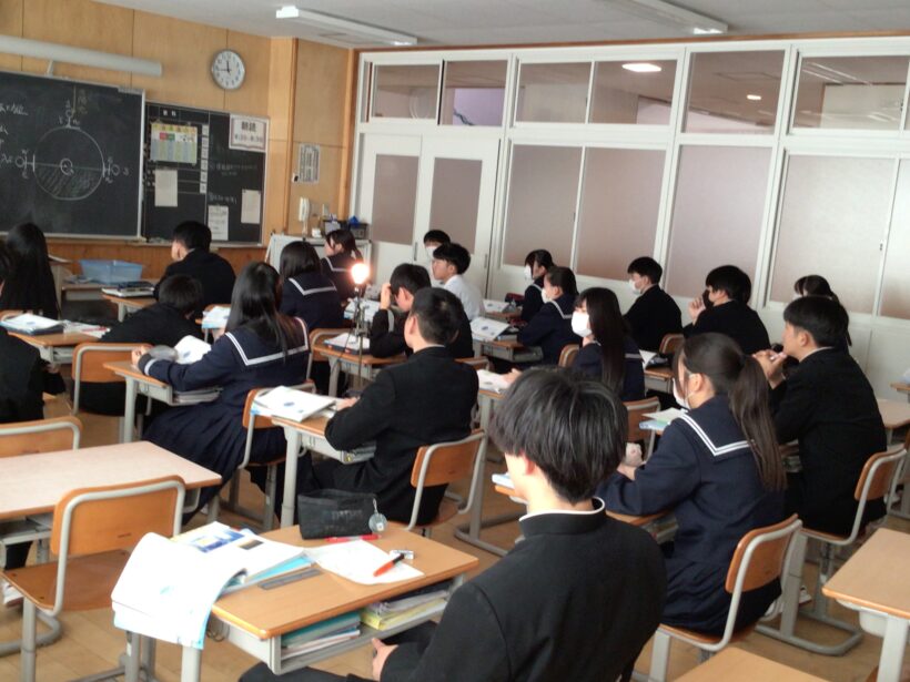 【3年生理科】太陽の1日の動きの学習です。回転と方位はなかなか理解が難しい単元です。教室の真ん中に太陽に見立てた電球を設置して、自分から、南中、日の出、日の入りはどの方角かを考えていましたが、イメージしにくいですね。