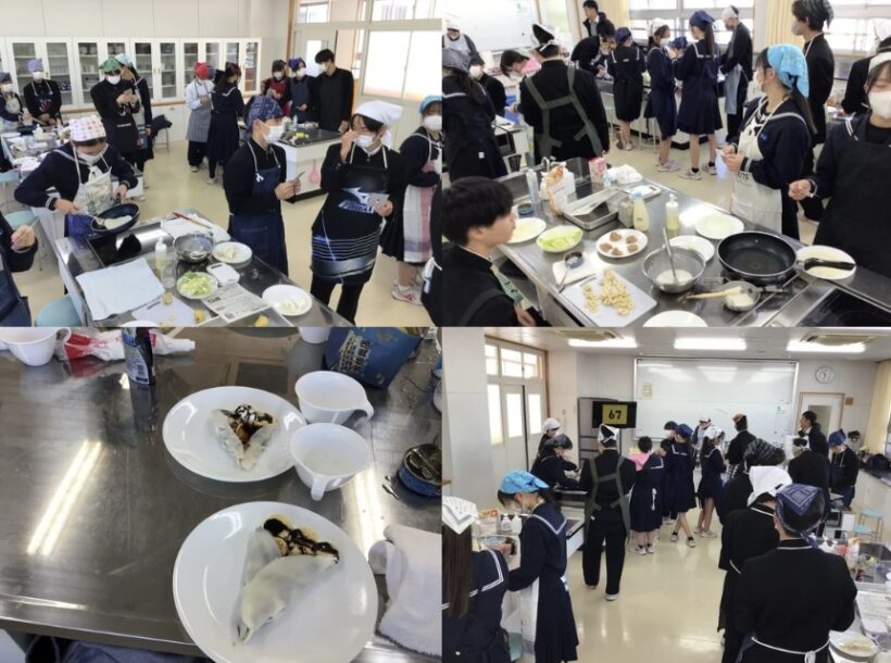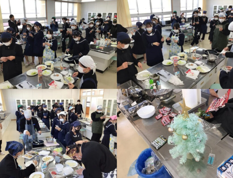 【3年生家庭科】お楽しみの調理実習です。みんなイキイキ嬉しそうにクレープを作っていました。ビンゴゲームでトッピングのお菓子がもらえるということで調理をそっちのけでやっている人も・・・・😅。下校時に感想を聴くと美味しくできて満足のようでした。🎶