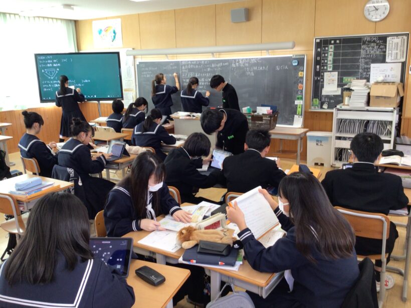 【2年生社会科】「開国後の政治と経済、江戸幕府の滅亡」の確認問題を自分たちで板書し、みんなで共有しています。