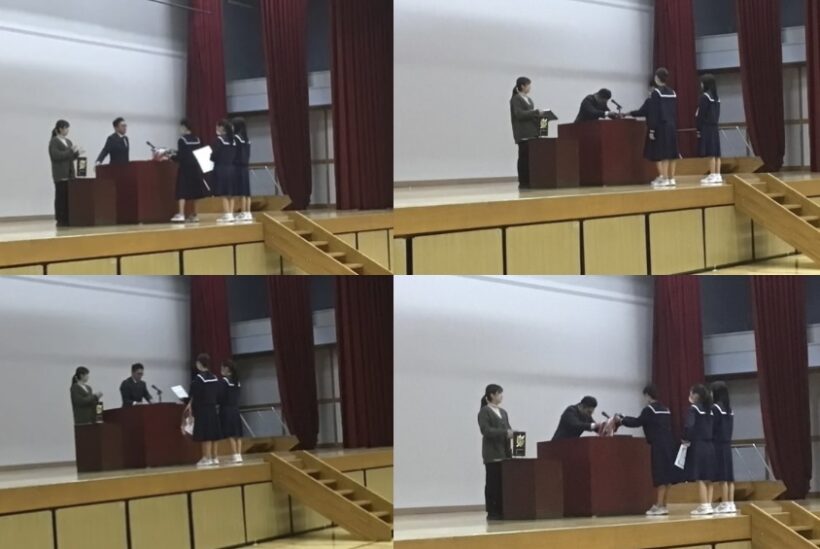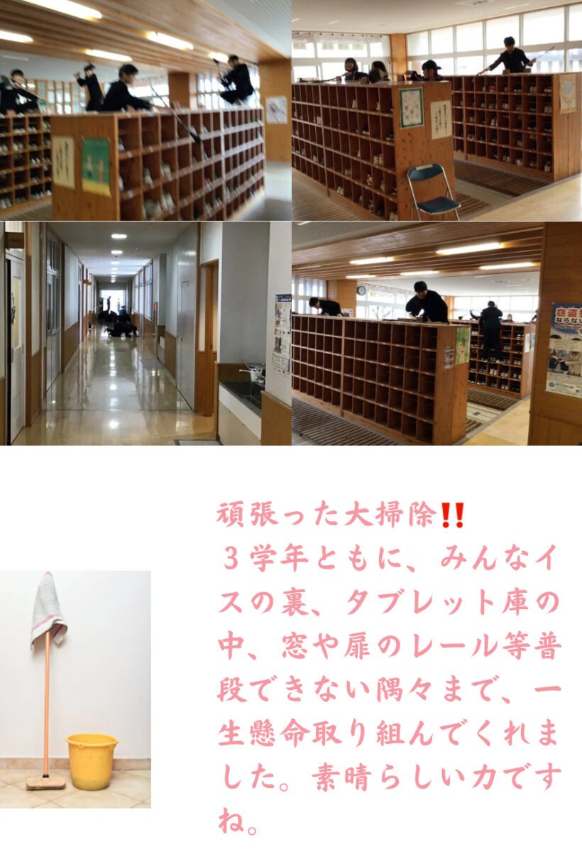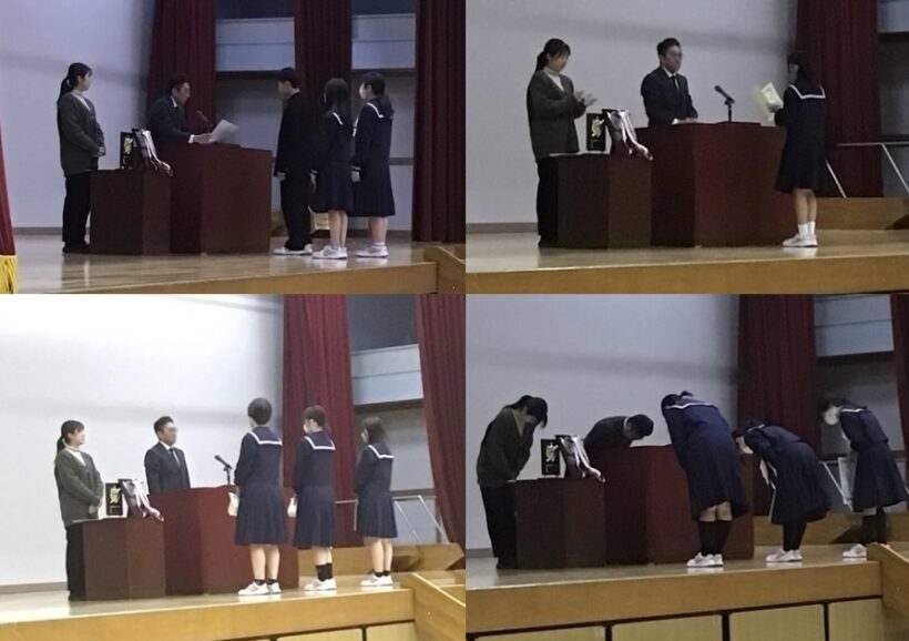 私から次のようなことをお伝えしました。二学期「考動」はできていましたか?3学期は、それに加えてもう一つ意識してほしいことを伝えました。それは、「しっかり挨拶をする」ことです。挨拶をするには、自分自身が規則正しい生活を送り、心にゆとりを持っていないとできません。そして相手の存在をきちんと意識し「あなたを大切に思ってますよ」という気持ちを持ってないと、心のこもった挨拶にはなりません。元気な挨拶は周りに元気を届けることができます。目を見て「ありがとう」と言える人は、信頼を育てることができます。3学期、この「挨拶をしっかりする」ことを目標にすると学校の空気がもっと明るく、もっと温かくなるはずです。冬休みは、事故や病気に気をつけて、元気に3学期の始業式に会いましょう。