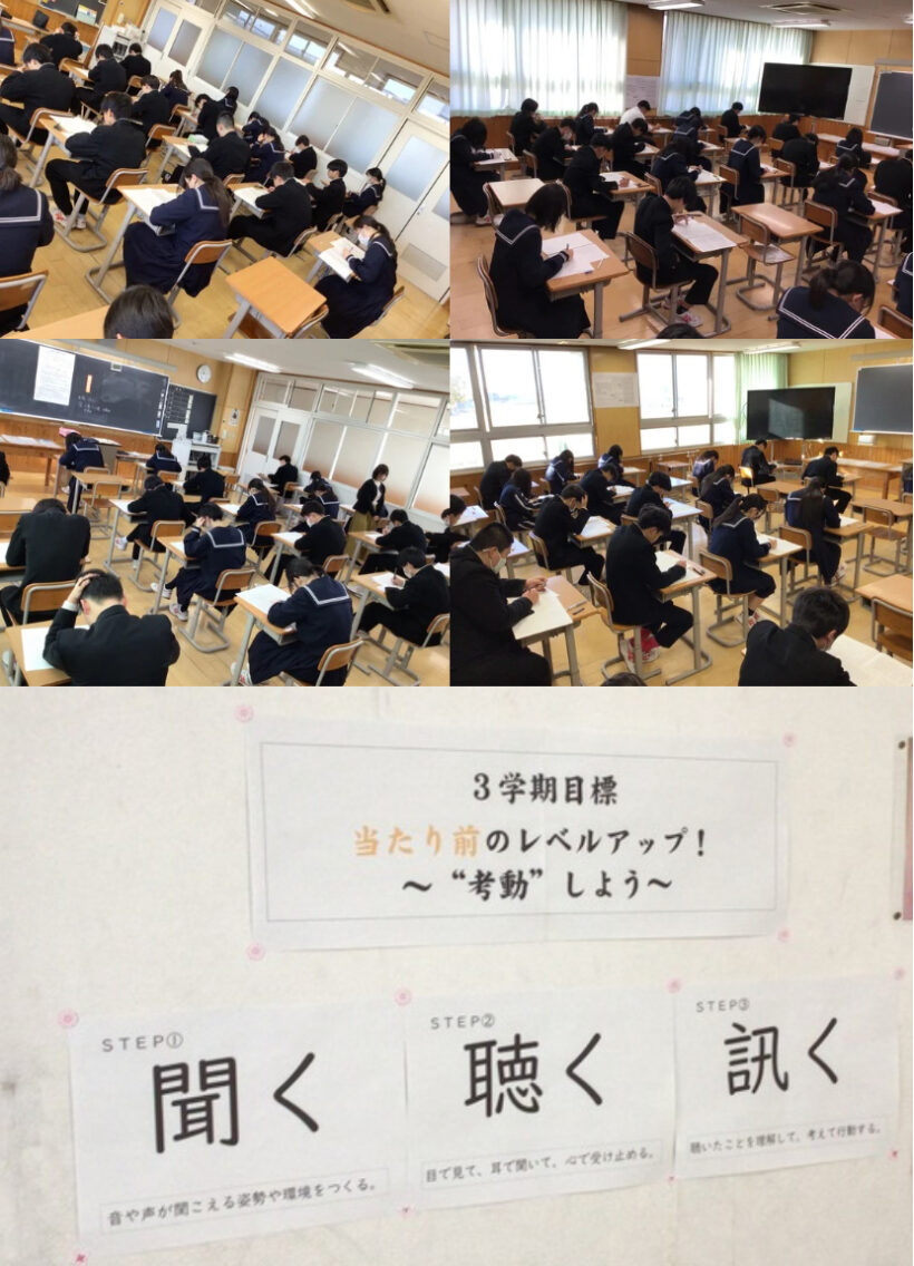 【1年生課題テスト】国語のテストに集中して取り組んでます。廊下の学年の3学期の目標が掲示されています。大切なことですね。