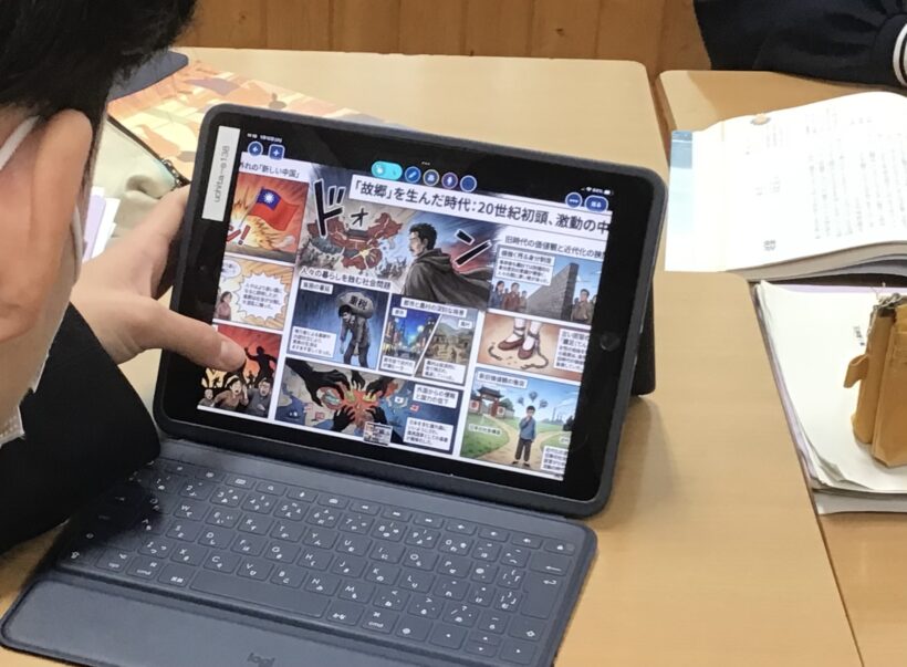 【3年生国語科】「故郷」を学習するにあたり、時代背景を想像できない生徒が多いので、予備知識として先生が歴史的背景をGoogleのNotebook LM(生成AI)を使い漫画風に作成した資料を確認していました。生徒は喜んで作品の時代背景に浸っていたようです。想像を働かせて本文にもチャレンジしてくださいね。