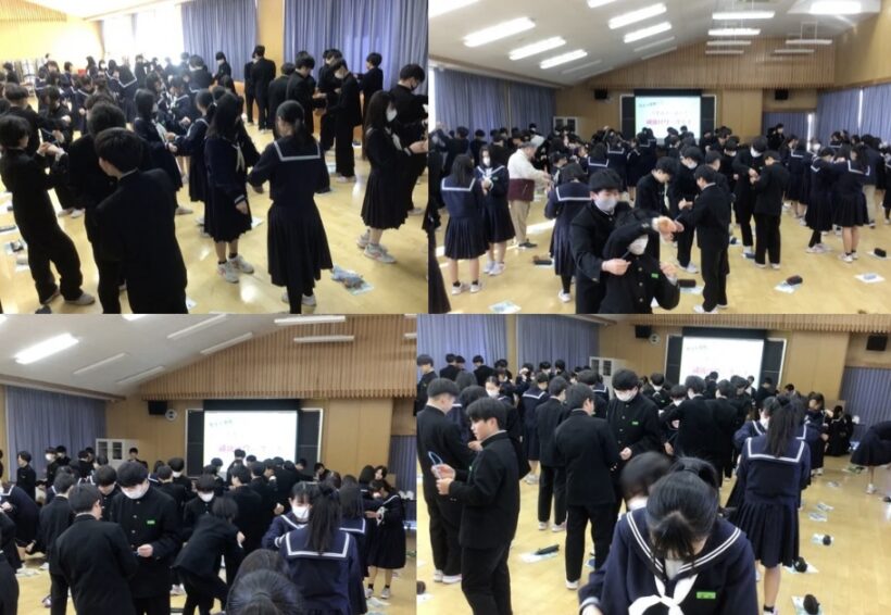 【2年生総合学習】今回は、身体と頭をフル回転させる「実践ワーク」で、工夫して身体を動かす楽しさとして体験するために2つのワークを行いました。①ストロー・リバース(集団ワーク)②魔法の縄抜け(ペアワーク)です。どちらのワークも大変楽しそうに生徒はいい笑顔で取り組んでました。その後「Be Active」の定義と重要性を学びました。最後に自分なりのアクティブを計画しました。自分が「これならやりたい」と思える動きを見つけることが大切ですね。