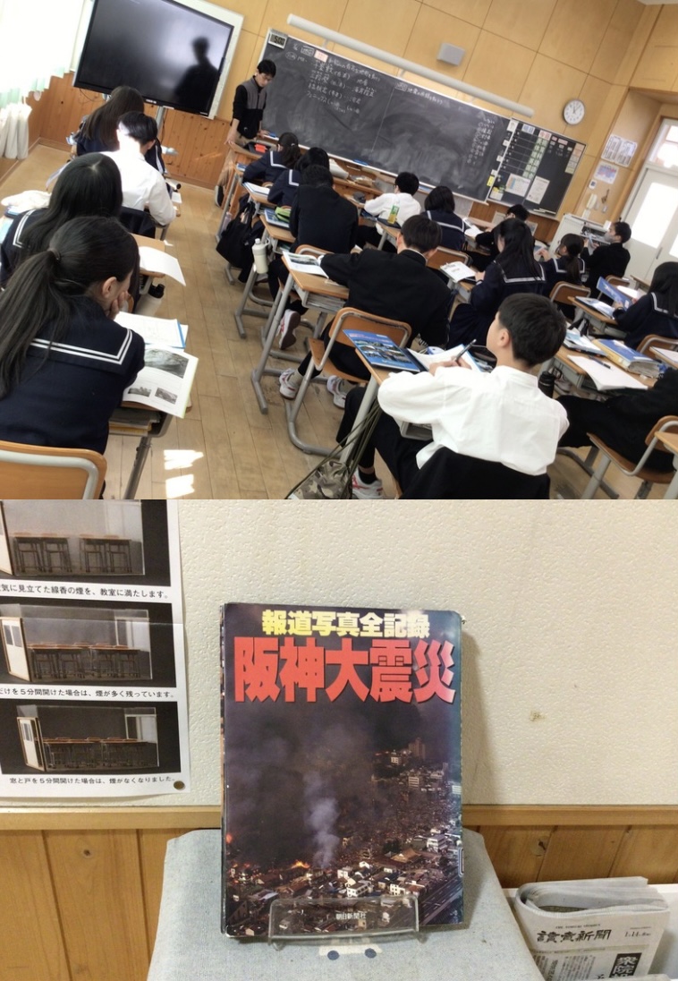 【1年生理科】阪神大震災、東動画を視聴して「地震の学習」をしていました。1.17日は阪神大震災が起きました。中学生の皆さんはまだ生まれていないので、昔の歴史的な事柄と捉えをしていますが、私たちには本当に衝撃的な出来事でした。語り続けていくことが大切だと思います。