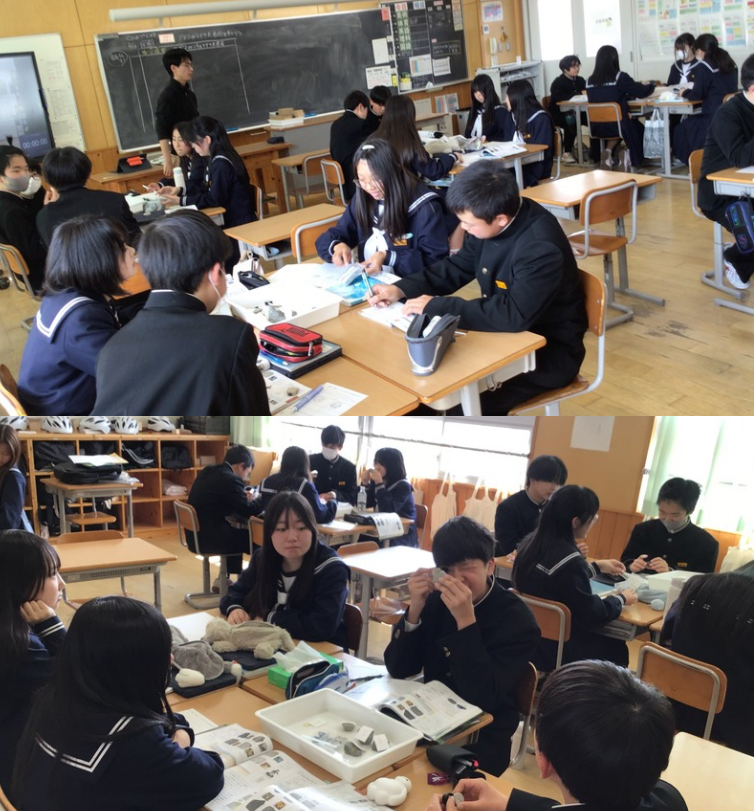 【1年生理科】火成岩の学習で様々な種類の岩石をルーペでよく観察してました。匂いを嗅いでいる生徒もいました。面白い見方ですね。😃