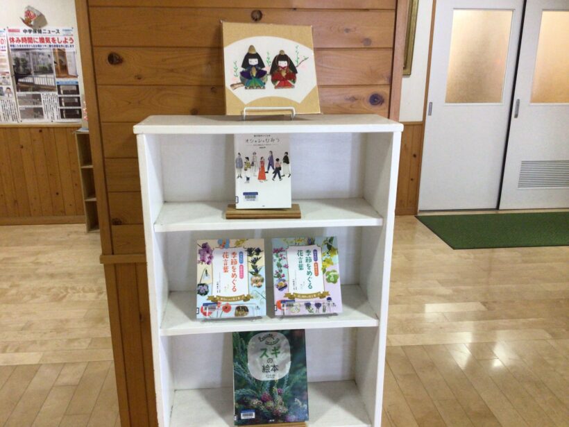 【校長室前文庫から】ひな祭りの季節がもうすぐやってきますね。スギ花粉の情報の本もありますので、興味がある人は手に取ってみてください。