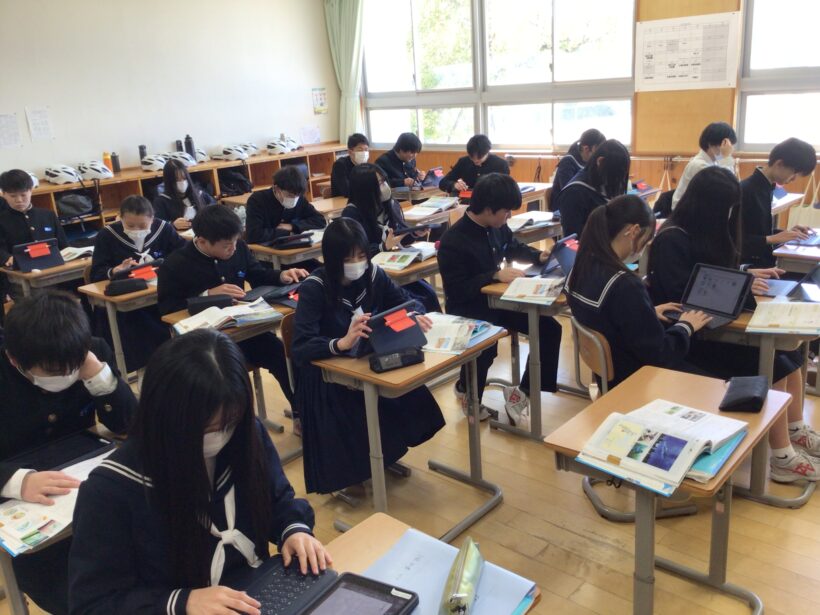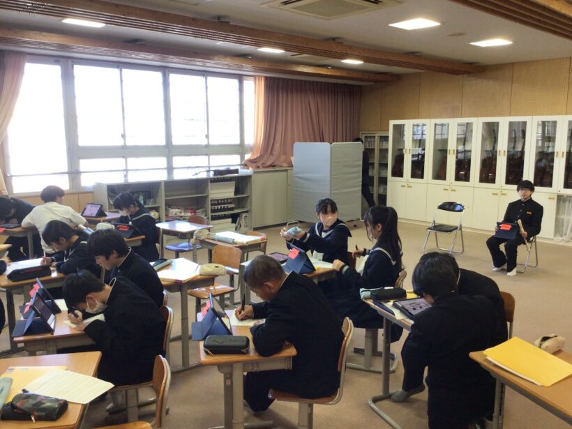 【1年生音楽科】アルトリコーダーの演奏テストを後ろのパーテーションのブースで「正しい指、ブレスの位置、音の長さ」の観点で採点します。待っている生徒は写譜をしています。