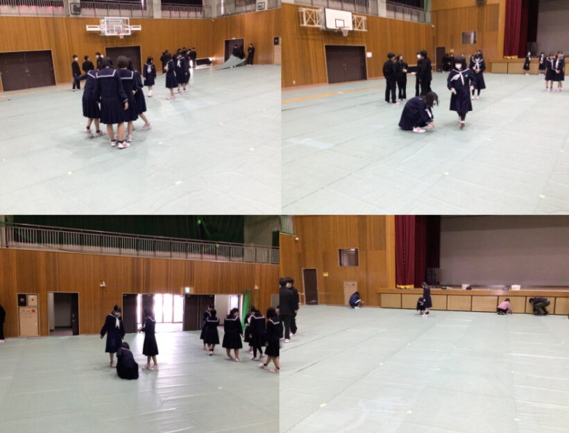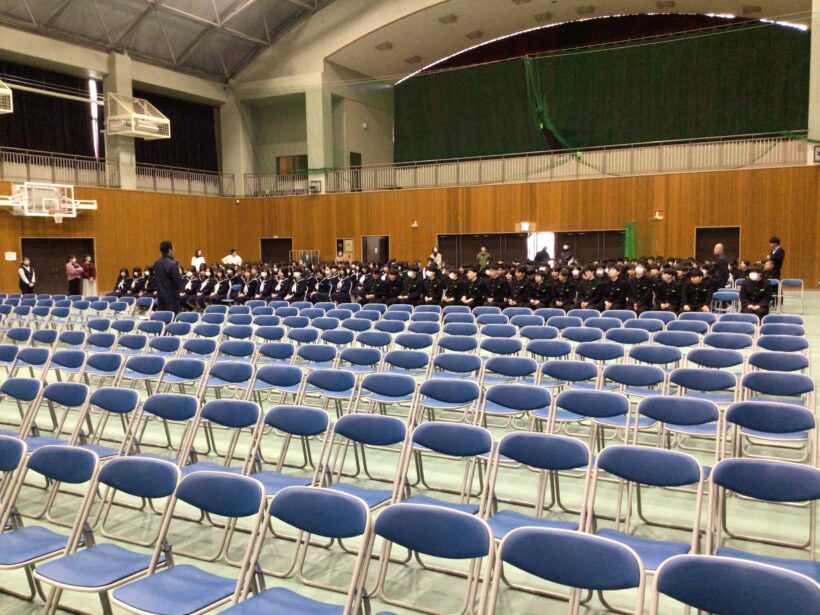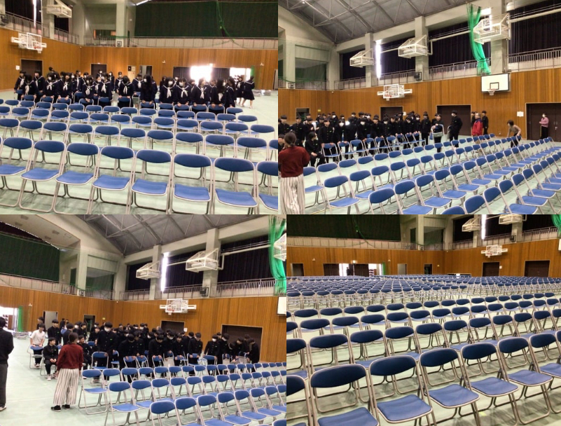 「卒業生を送る式です。厳かな時間になるように心がけてください」と拍手、起立・礼等の所作、イスへの座り方、歌について1、2年生在校生に向けての話がありました。
