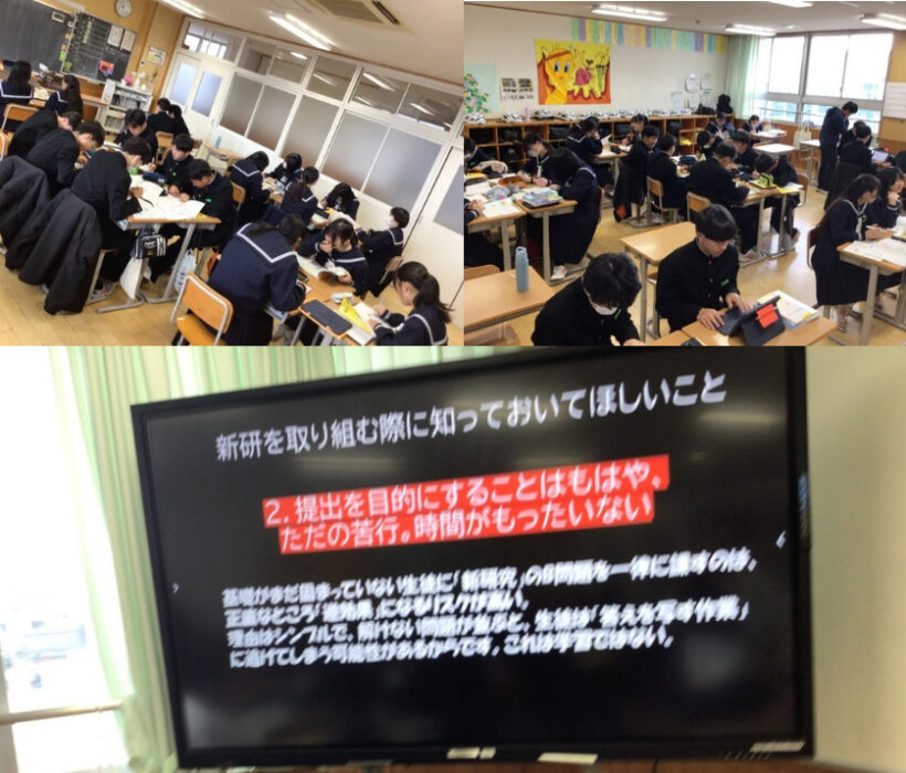 【2年生社会科】新研(3年間のまとめ)の問題集に取り組む際に知っておいてほしいことを、先生から皆さんへ話がありました。「提出を目的とすることは、もはやただの苦行。時間がもったいない」という言葉が印象的でした。学習として何が大切で自分のためになるかをしっかり考えて三年生への土台を築きましょう。