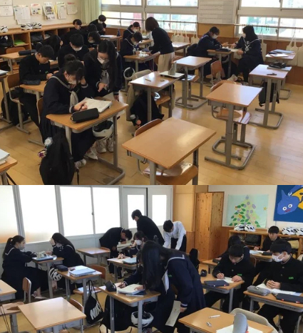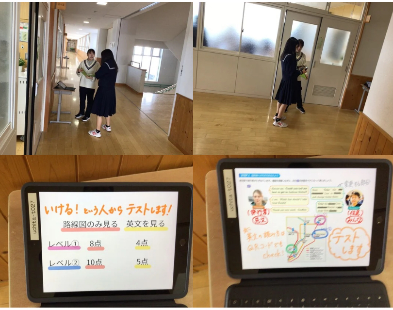 【2年生英語科】電車の乗り換えでのスピーキングです。めあて「状況や相手の要望に応じて、乗り物での行き方を伝えることができる」の学習で、各自練習した後に、スピーキングテストをしていました。緊張しながらも、自分でレベルを選び意欲的に取り組んでました。