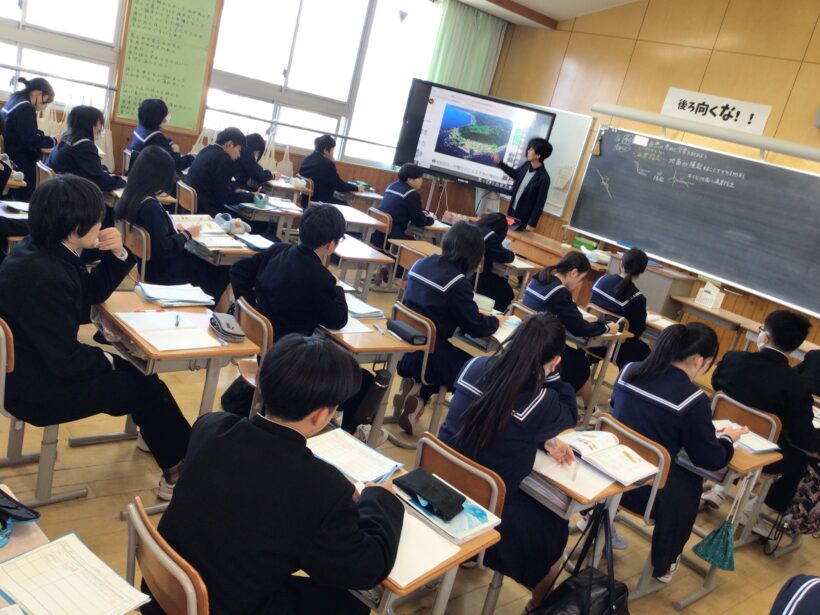 【1年生理科】海岸段丘のでき方の学習です。「和歌山県ではどこにあるでしょうか?」に何人かの生徒は「千畳敷」と答えていましたが、まだまだ馴染みが薄い生徒もいました。年齢を重ねてくると景勝地にも興味が湧いてくるので覚えやすいですが・・・・。