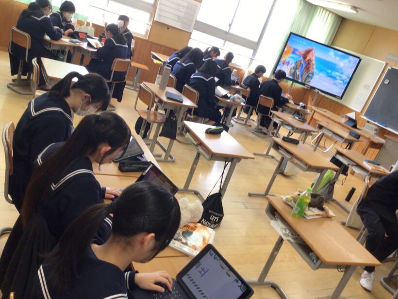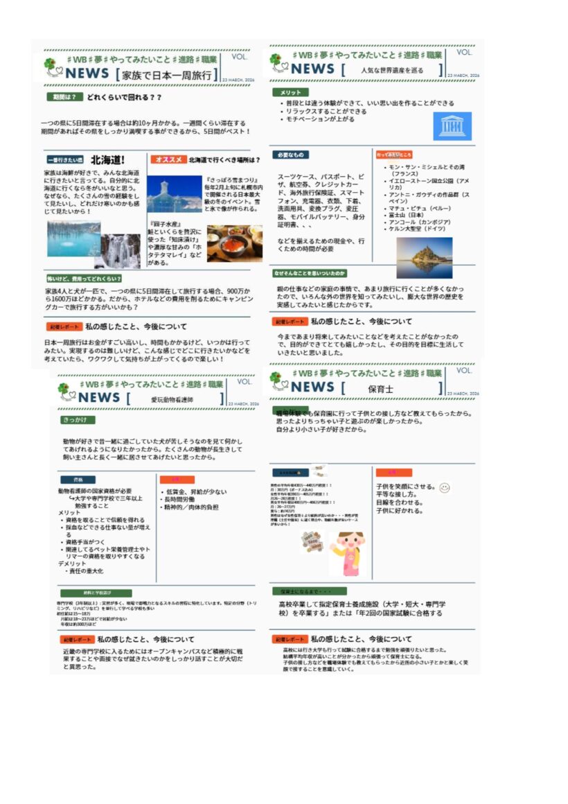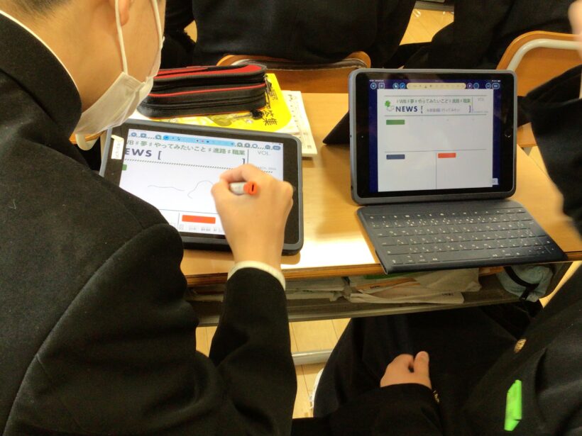 【2年生社会科】 キャリア✖️ウェルビーイングをテーマに将来の目標や夢を考えていました。「夢」や「やってみたいこと」がある人は将来の幸福度が3倍変わるという結果があるようです。その話を受けて各自、My NEWS Letterを作成しています。