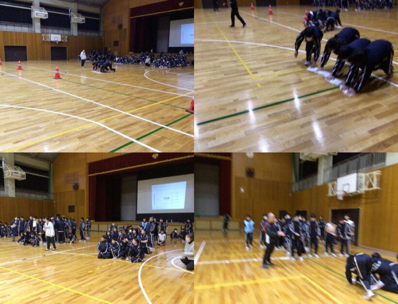 【1年生学年レクリエーション】3〜4人で1チームを作り、特製の長いぞうきんがけでリレーです。思っていたよりもなかなかうまく進まないようです。足がついていかず遅れてしまう、隣の生徒とぶつかてしまうなど大変でしたが、笑顔で最後まで取り組んでました。