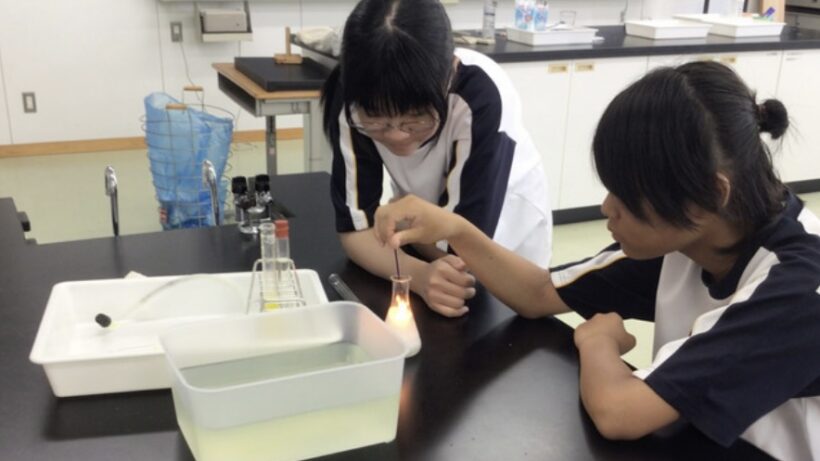 【1年生理科】風呂がま洗浄剤とお湯でを酸素を発生させる実験です。たくさん泡が出たんですが、小さい泡では線香が激しく燃えにくく、大きい泡に線香を近づけたらこんなに激しく燃えました。「おおすごい‼️」と私が声を出して喜んでしまいました。