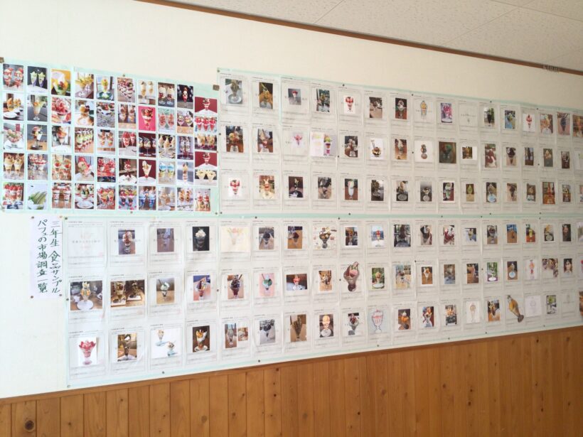 美術室前廊下には「3年生の食品サンプルパフェの市場調査一覧」が掲示されてます。夏休みにお店に行ったり、ネットから調べたようです。