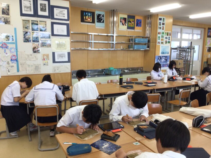【2年生美術科】ネームプレートを粘土で制作しています。下書きを終えた人は、掘る作業に取り組んでいます。みんな黙々と集中しています。焼き上がるとどんな作品になるか楽しみですね。