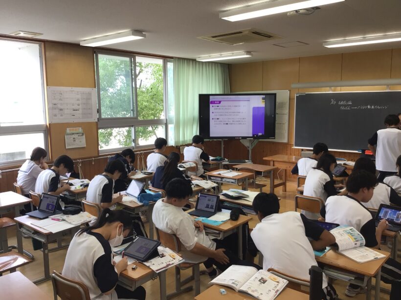 【3年生理科】「エネルギー」の章の単元のまとめです。2つの動画を視聴して「江戸時代に、石を水中につるして運ぶ船があった。なぜ石を水中につるしていたのだろうか?」という問題にチャレンジしています。学習したことを元に考える最近の傾向の問題に挑戦していました。水の浮力の関係を使いますが、なかなか苦戦していました。