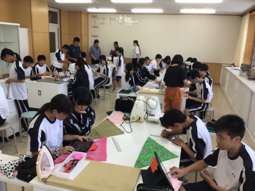 【1年生家庭科】ミシンの実習です。なかなかミシンの取り扱いも慣れていないので、少し困っているようでしたが、先生・友達に聞いて教えてもらいながら取り組んでました。