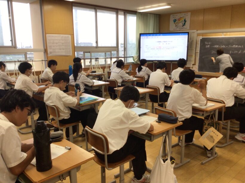 【2年生数学科】めあて「一次関数と方程式の関係を知る」の学習です。2元一次方程式を今までに学習したy=ax+bの形に変形してグラフを書くことができましたか?次の時間はまた違う方法でのグラフの書き方を学びます。