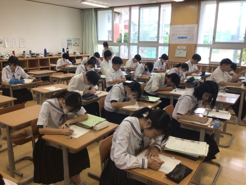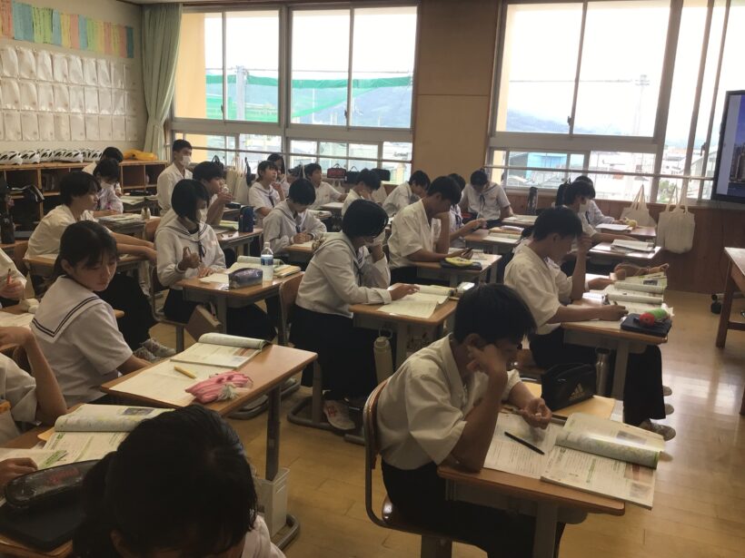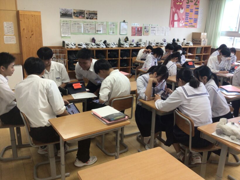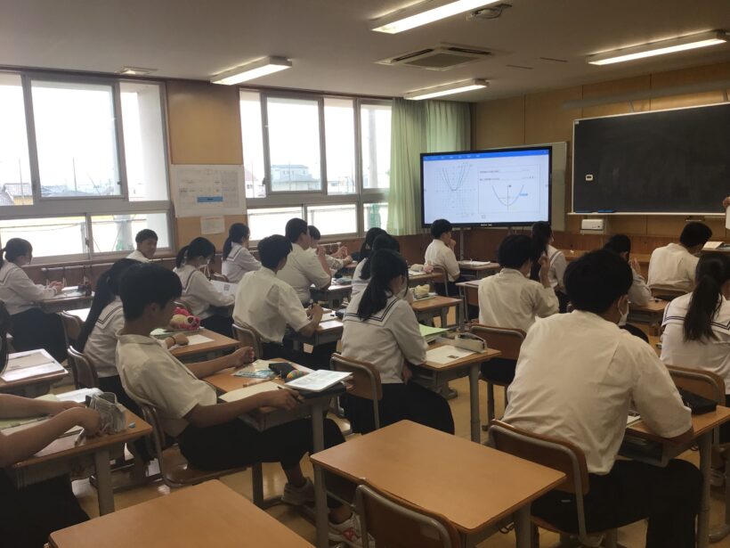 【3年生数学科】こちらのクラスも二次関数の学習です。二次関数は、物の動きや変化を読み解く「数学のレンズ」です。スポーツのボールの軌道、経済のグラフ、自然現象など身の回りの「なぜ?」を考える力になります。