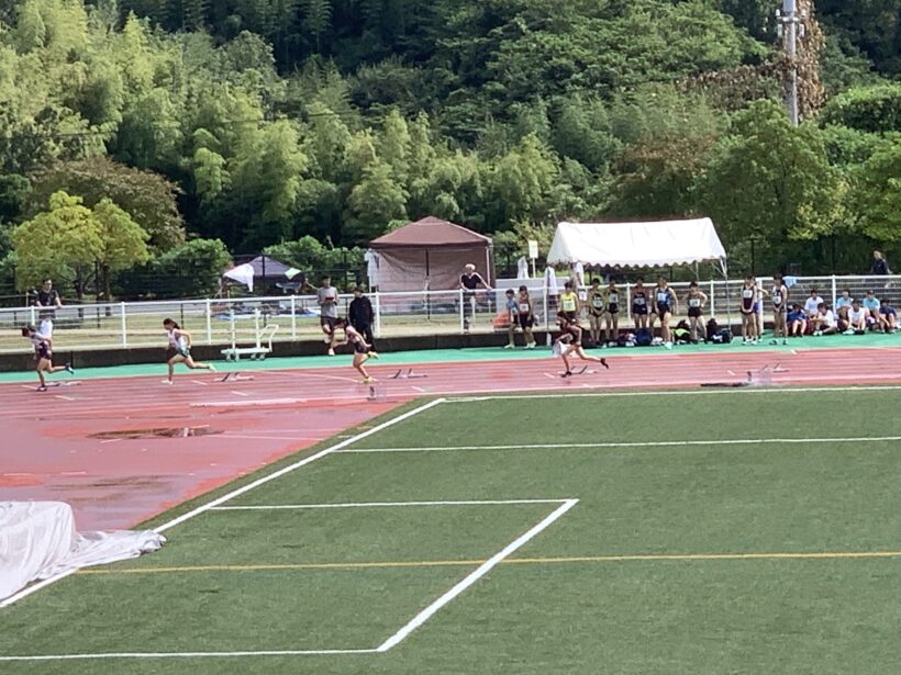 県の陸上大会が11日(土)に田辺市のスポーツパークで行われました。午前中雨が降ってきて大変でしたが、皆さん自己ベストに挑戦することができました。