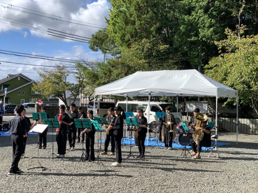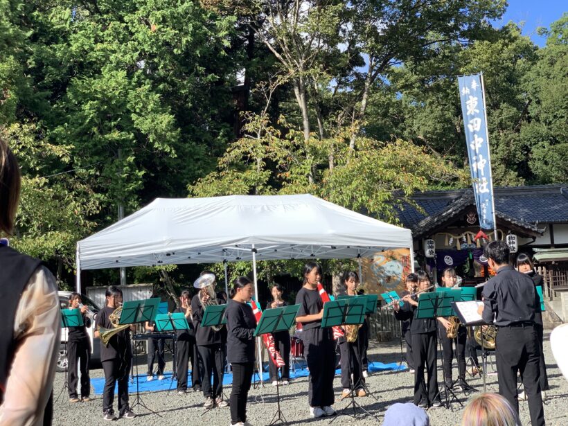 本校吹奏楽部が13日(月)に東田中神社より例年同様演奏のご依頼頂き、出演してきました。名探偵コナンの「テーマソング」から始まり、名探偵コナンの映画の主題歌 aikoさんのの「相思相愛」エヴァンゲリオンの「残酷な天使のテーゼ」、「風になりたい」の4曲を演奏しました。保護者、地域の方々がたくさん来て手拍子等で盛り上げいただきました。ありがとうございました。😃生徒の皆さんにとって演奏だけではなく、準備後片付け等でも学べる機会になったと思います。