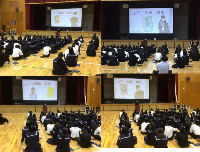 上野山さんが薦める「カラフル」、中井さんが薦める「空想科学読本」久保さんが薦める「変な絵」、谷野さんが薦める「ざんねんないきもの辞典」の発表を聞き、質問等した後にタブレットで投票しました。結果発表は来週のようです。参加者の声・・・「本を読まない僕は今回の発表を機に読もうと思えました。読書に苦手な意識を持っている人へのきっかけ作りになる」と話してくれました。