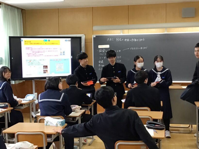 【3年生社会科】めあて「国会の地位と仕組みを知る」の学習です。教科書等から重要なところをインプットしてプリントに整理し、グループで共有ノートにまとめていきます。その後作成したプレゼン資料を発表していました。
