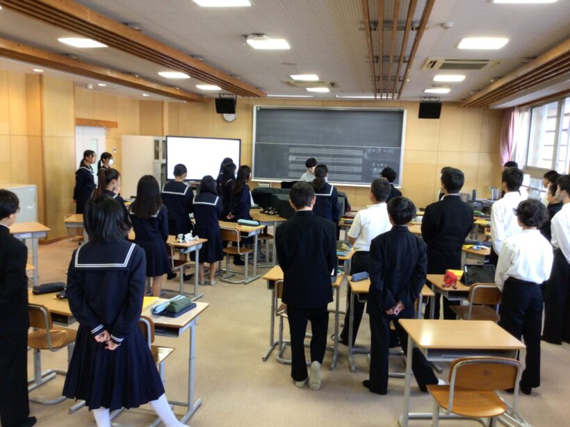 【1年生英語科】現在進行形の学習です。初めに単語・語句の練習でした。これはよく使うからしっかり覚えておくようにと先生から指示がありました。「look forward to〜」この意味はわかりますか?