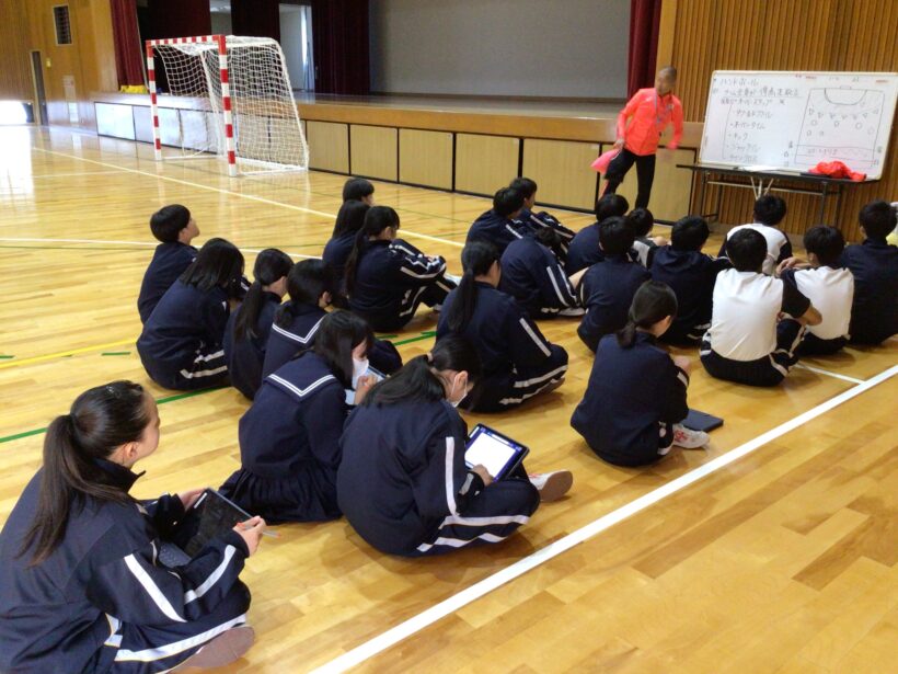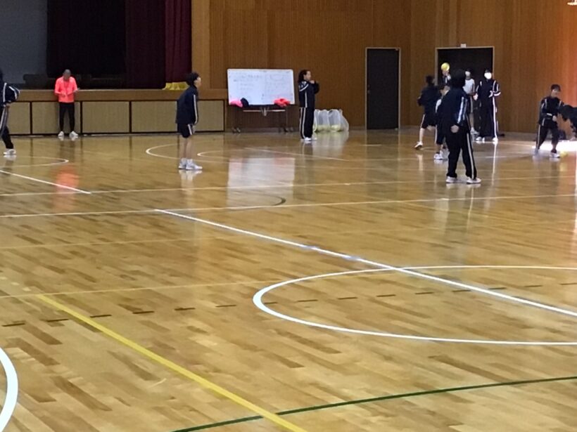 【1年生体育科】めあて「チーム全員が点を取る」のハンドボールの学習です。最初に説明を聞き、その後はパスやシュートの練習です。