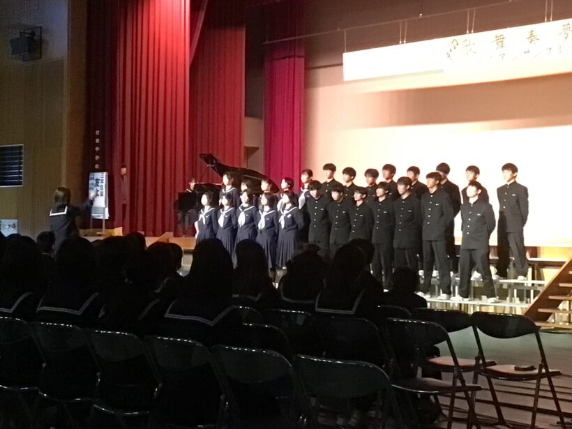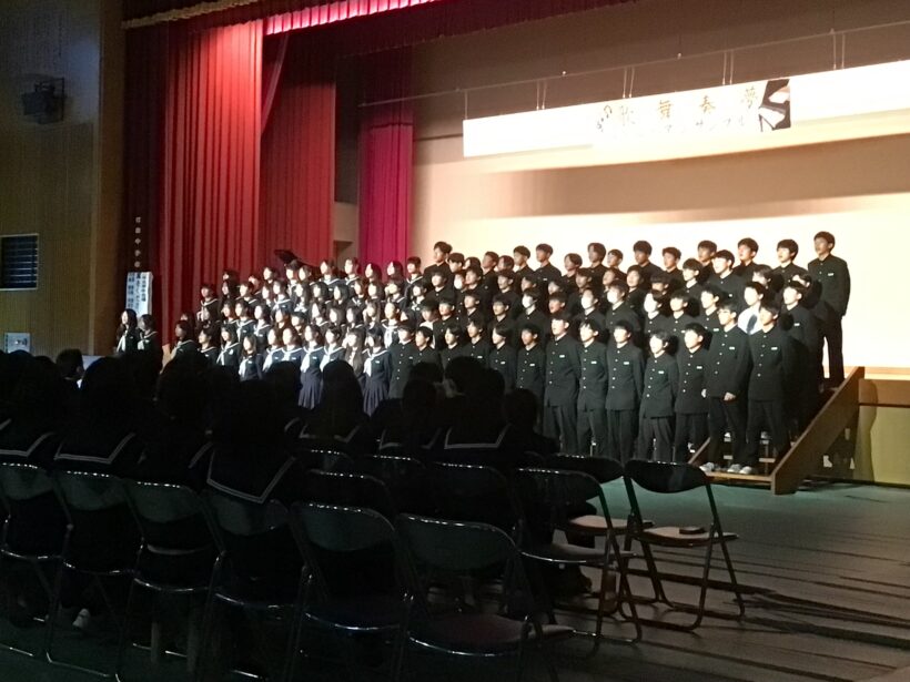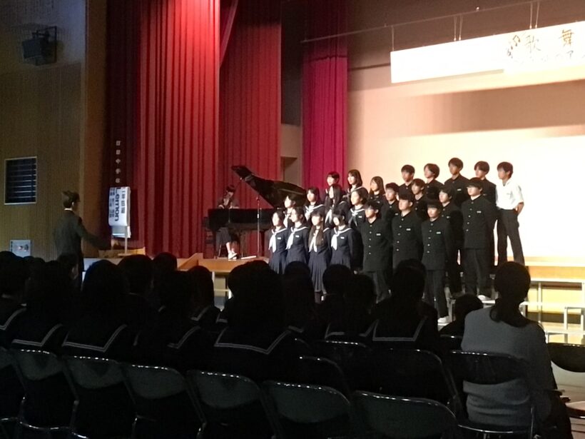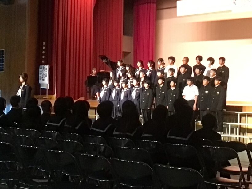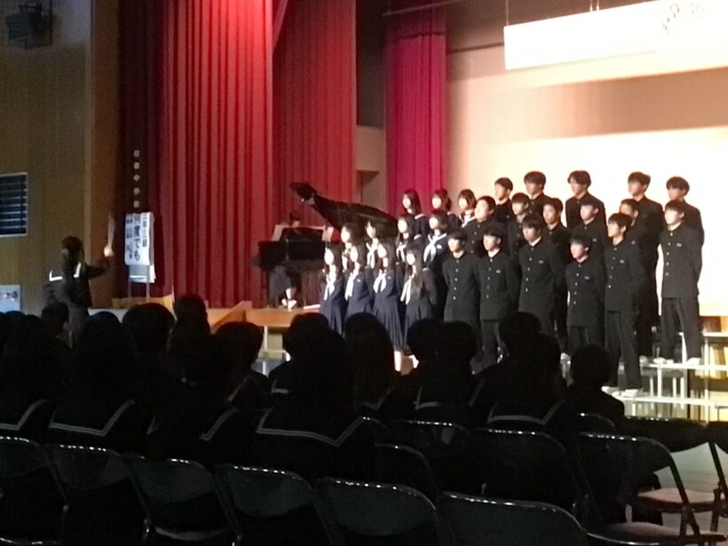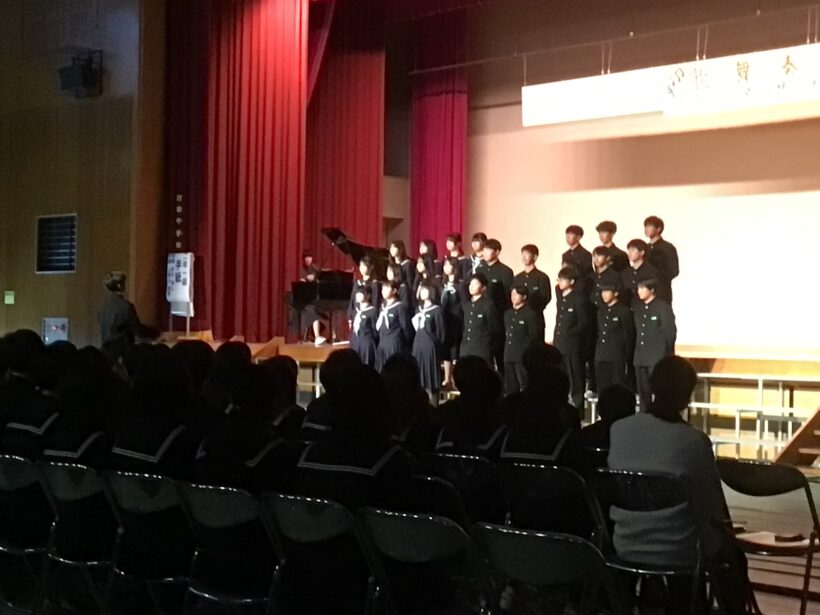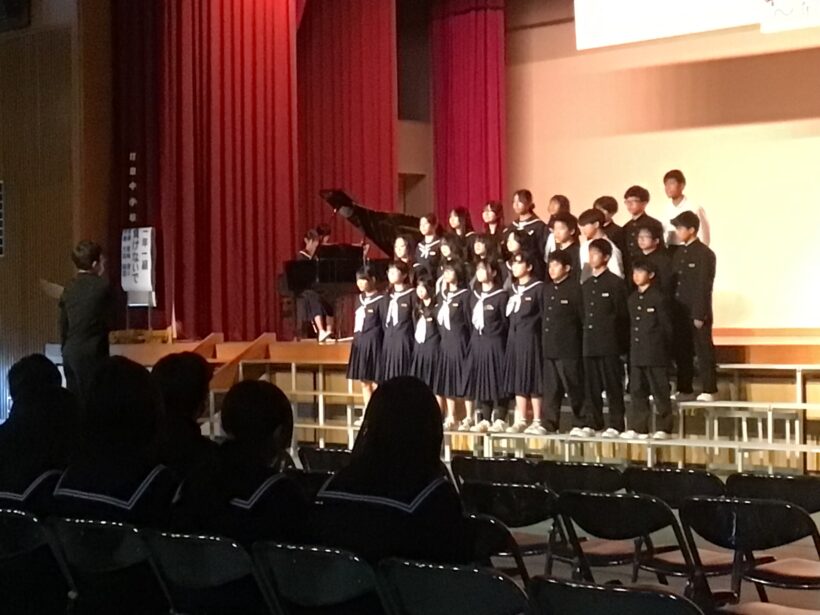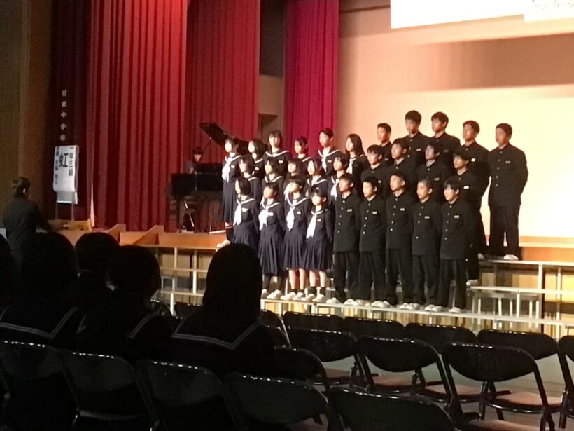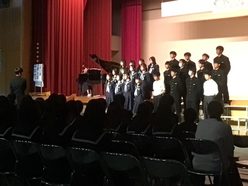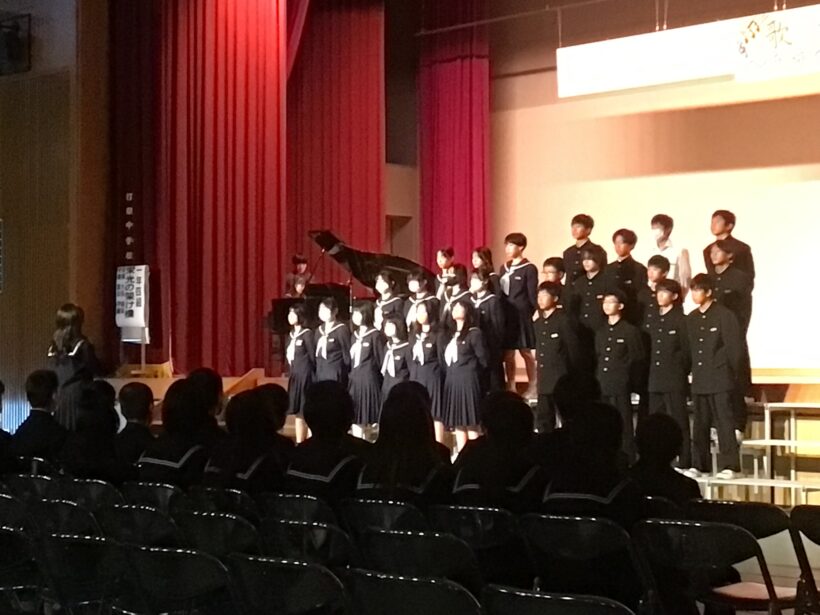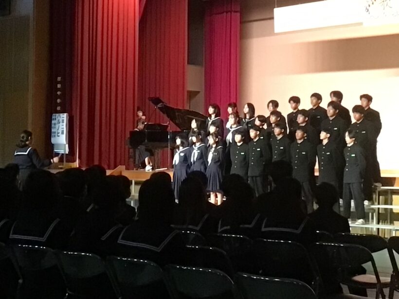 【講評から】1年生は元気のある声、2年生は合唱としてのまとまり、3年生はしっとり聞かせるハーモニーをそれぞれ聞かせてくれました。学年が上がるにつれて合唱としての完成度が上がってきて頼もしく感じました。皆さんの表情、姿勢、そして歌声から、これまでの積み重ねと仲間との絆がしっかり伝わってきました。この経験を糧に、これからの学校生活でも互いを思いやり、力を合わせて挑戦してください。皆さんの未来が、今日の歌声のように、力強く、美しく響き渡ることを願っています。