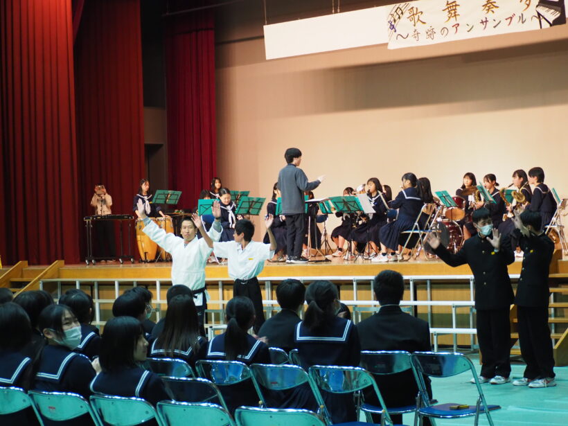 「マツケンサンバ」の演奏曲では先生も生徒も参加し、会場を盛り上げてくれました。